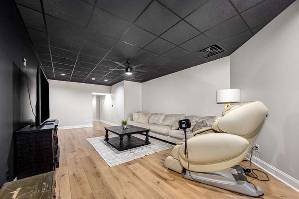The full concrete-wall basement offers a separate living area, game room, flex space (could be used as a bedroom or 2nd office), & a hidden room with Murphy door. Additional highlights: cedar beams, low-e oversized windows, automated window treatments, & oversized sliding glass doors opening to the pool.