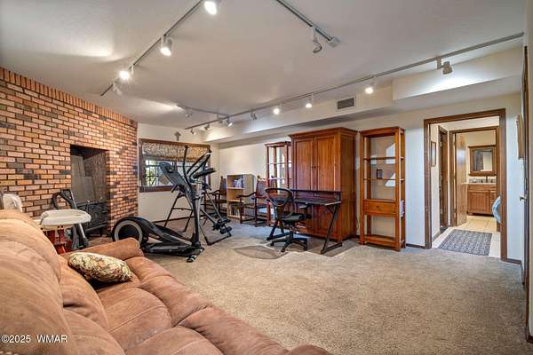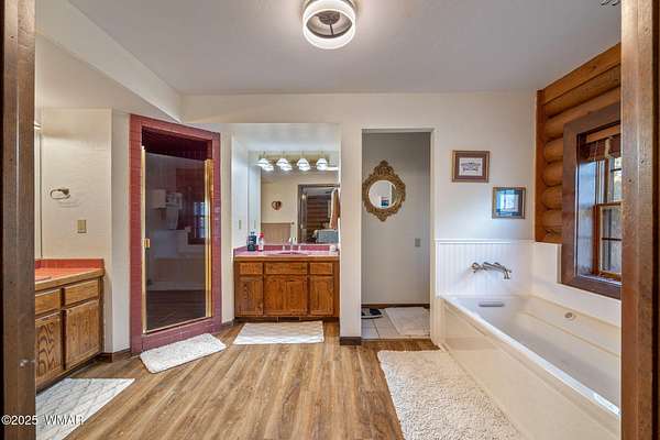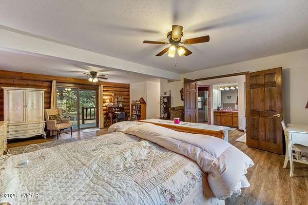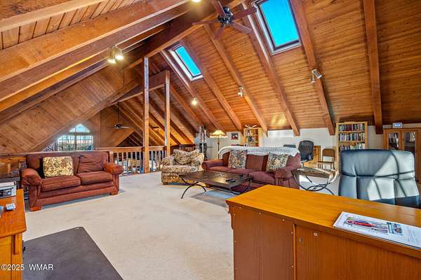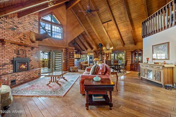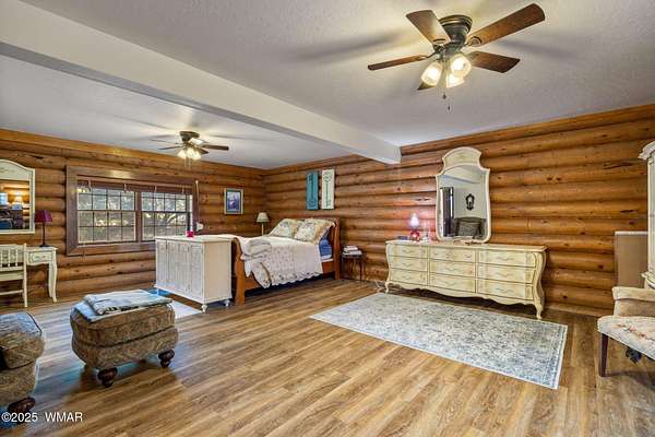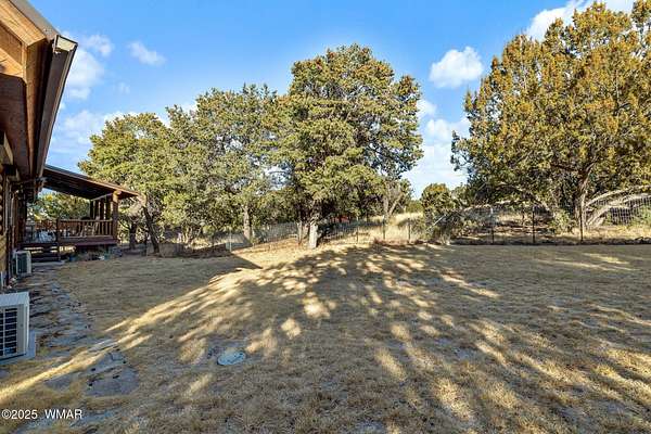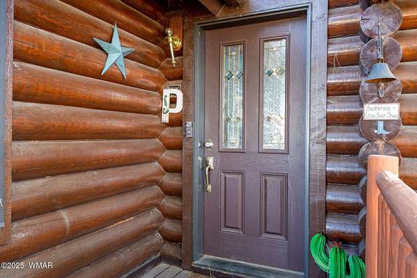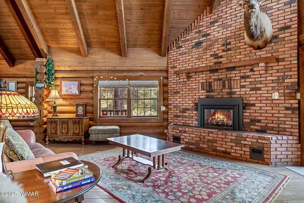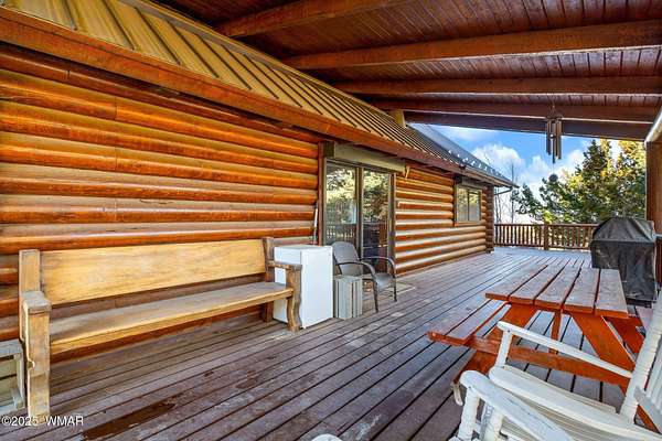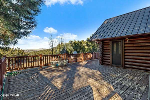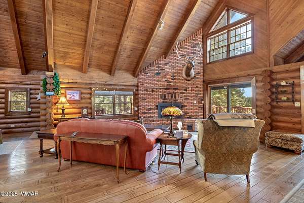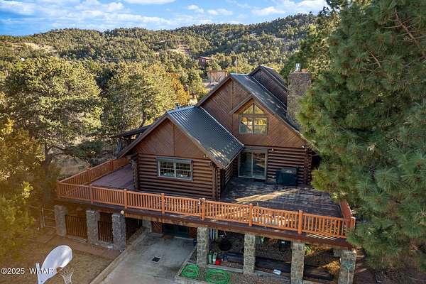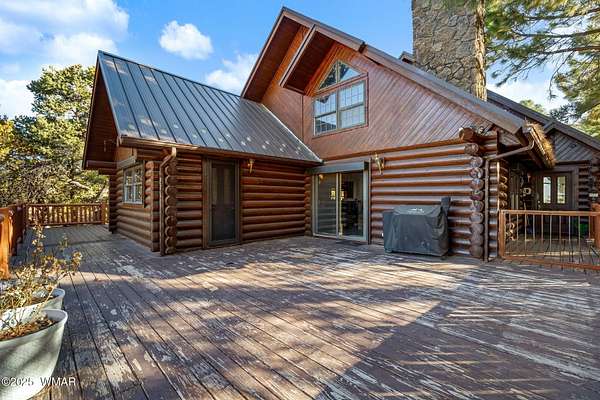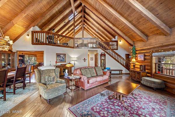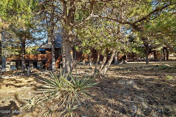 Nestled at the edge of town, this well maintained, rustic, log cabin strikes the perfect balance of seclusion & convenience. Just a short drive from town & a quick walk to National Forest land, it's an outdoor enthusiast's dream. Inside, high ceilings & a spacious layout provides room to spread out. The main floor's open living area seamlessly connects to the kitchen, dining, and an additional connecting study/den. The large primary suite offers a walk-out door to the deck, a luxurious jetted tub, & separate dual vanities. Upstairs, a cozy loft serves as a relaxing retreat, additional sleeping quarters, & easy access to attic storage. The basement features a generous living area w/wood stove, ideal for a media room or home gym, plus a large walk-out storage area. Set on 3.32 acres and surrounded by towering pines, the property offers plenty of space to enjoy the cool White Mountain air. Multiple decks and porches surround the home, perfect for relaxing or entertaining. A barn, stable, and corral are ready for horse lovers, while a well-maintained lawn and large basketball court offer space for outdoor fun. Call today for a showing!