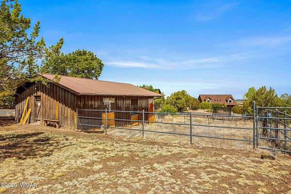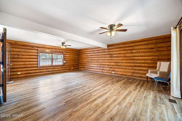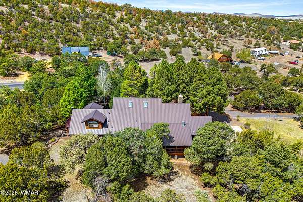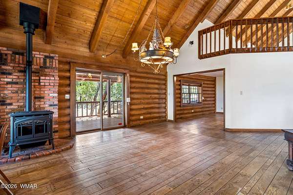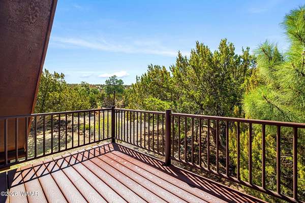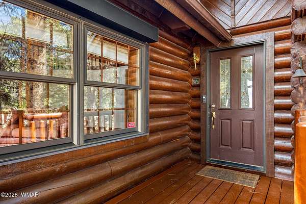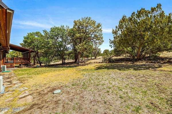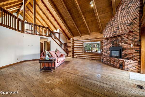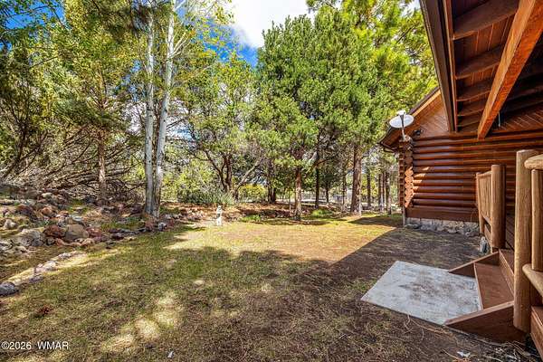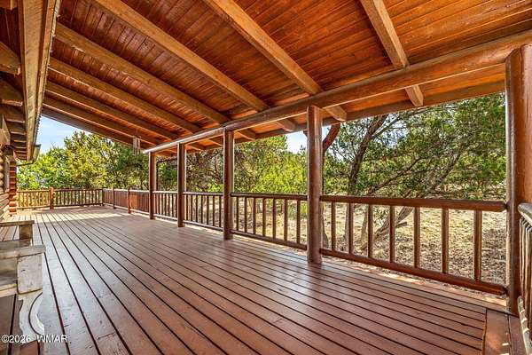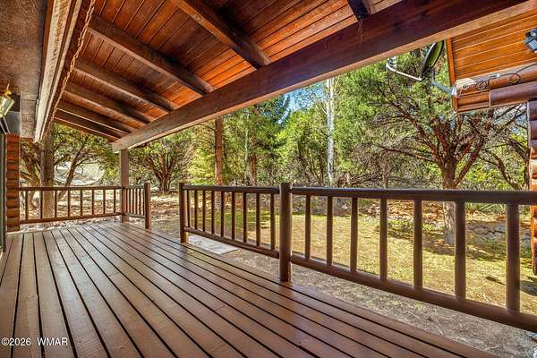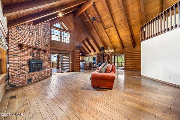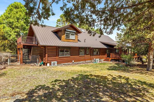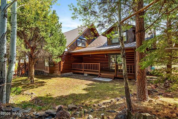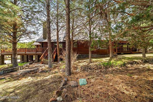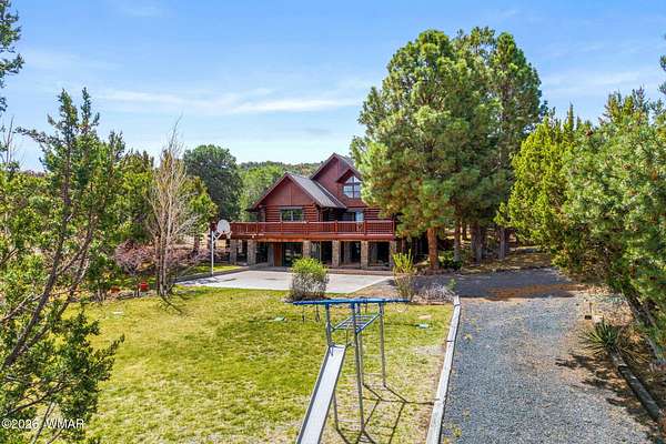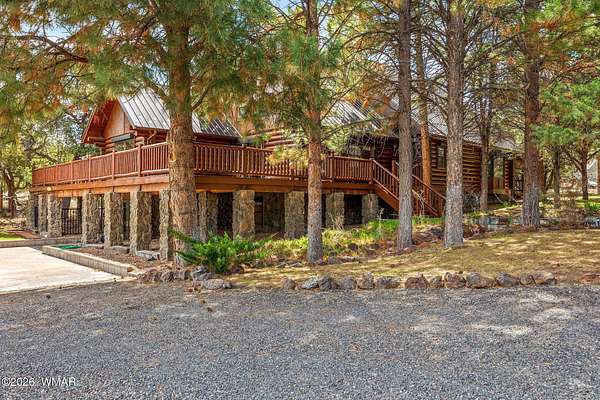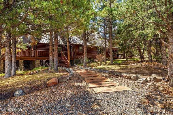 Beautifully maintained log cabin with the exterior and all decks completely refinished and restored--offering fresh curb appeal and lasting quality from the moment you arrive. Located in town yet offering a peaceful, private setting that feels miles away, this property also sits within walking distance to National Forest land--perfect for outdoor enthusiasts. Set on 3.32 acres surrounded by tall pines, you'll enjoy the cool White Mountain air and room to roam. Multiple decks and covered porches wrap the home, perfect for entertaining or unwinding. The property is fully equipped for horse lovers with a barn, stable, and corral, and also features a manicured lawn and full basketball court for added outdoor enjoyment. Inside, soaring ceilings and an open-concept layout create a bright, inviting living space. The main level seamlessly connects the living room, kitchen, and dining area, along with a flexible den or study. The spacious primary suite features private deck access, dual vanities, and a relaxing jetted tub. Upstairs, a cozy loft provides additional sleeping space or a quiet retreat, along with easy attic storage access. The finished basement adds even more versatility with a large family room featuring a wood stove--ideal for a media room, game area, or home gym--plus a walk-out storage space.