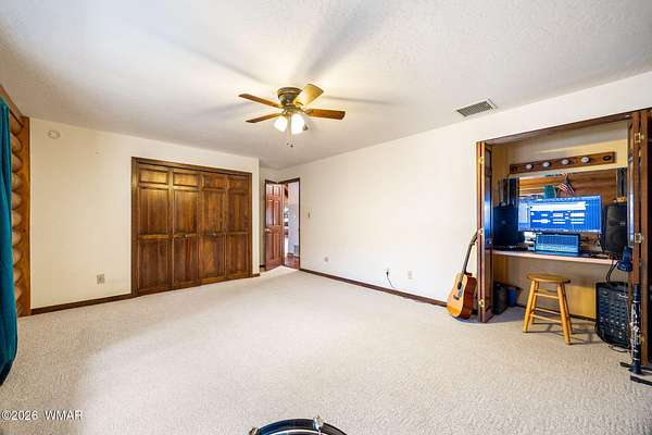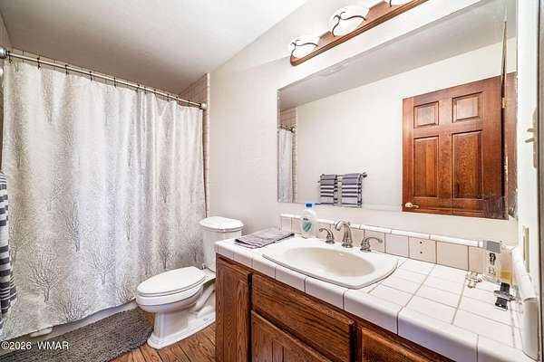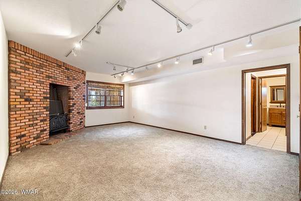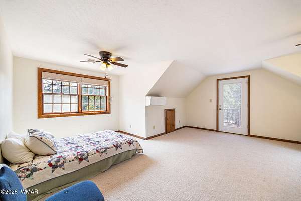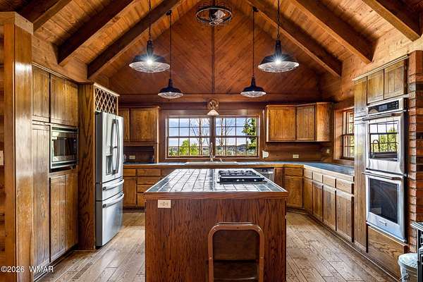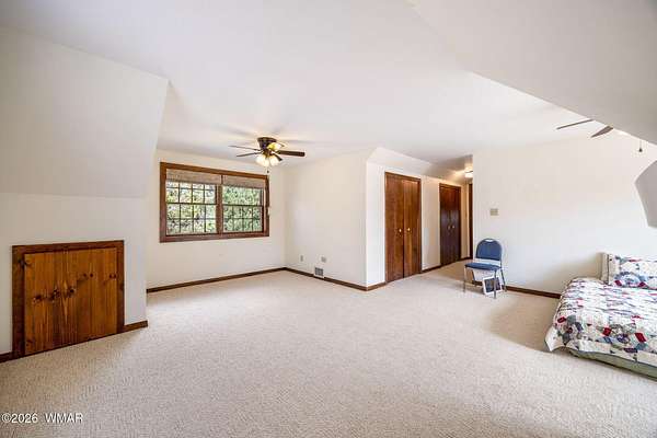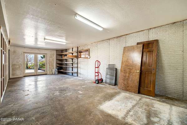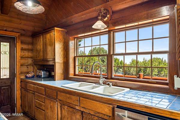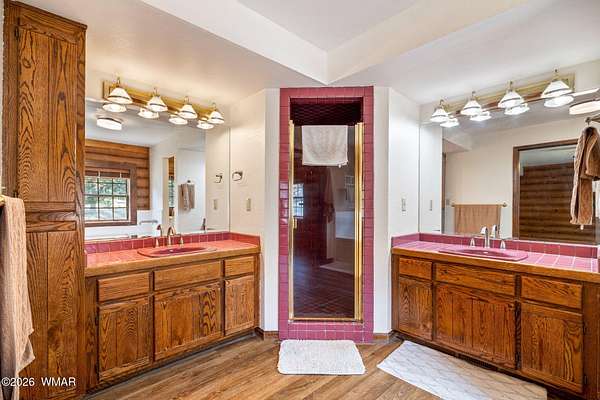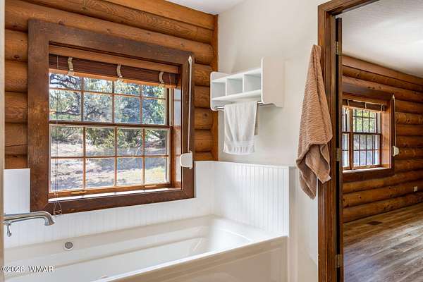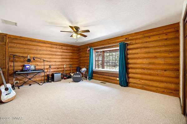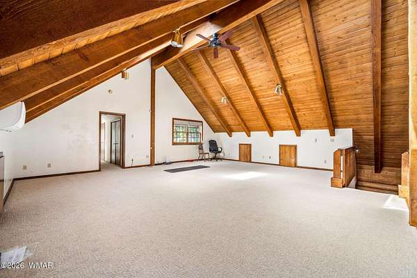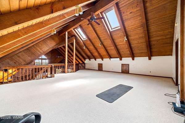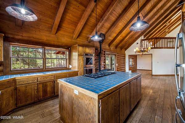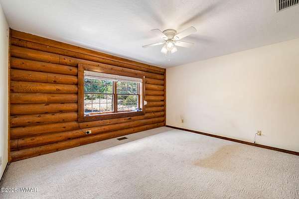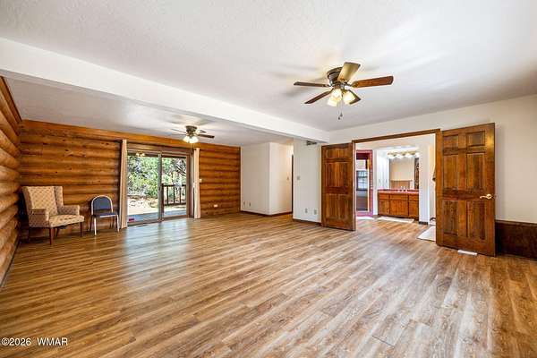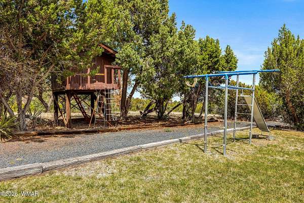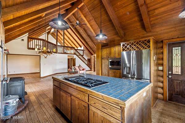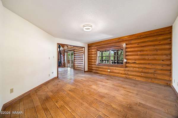 Beautifully maintained log cabin with the exterior and all decks completely refinished and restored--offering fresh curb appeal and lasting quality from the moment you arrive. Located in town yet offering a peaceful, private setting that feels miles away, this property also sits within walking distance to National Forest land--perfect for outdoor enthusiasts. Set on 3.32 acres surrounded by tall pines, you'll enjoy the cool White Mountain air and room to roam. Multiple decks and covered porches wrap the home, perfect for entertaining or unwinding. The property is fully equipped for horse lovers with a barn, stable, and corral, and also features a manicured lawn and full basketball court for added outdoor enjoyment. Inside, soaring ceilings and an open-concept layout create a bright, inviting living space. The main level seamlessly connects the living room, kitchen, and dining area, along with a flexible den or study. The spacious primary suite features private deck access, dual vanities, and a relaxing jetted tub. Upstairs, a cozy loft provides additional sleeping space or a quiet retreat, along with easy attic storage access. The finished basement adds even more versatility with a large family room featuring a wood stove--ideal for a media room, game area, or home gym--plus a walk-out storage space.