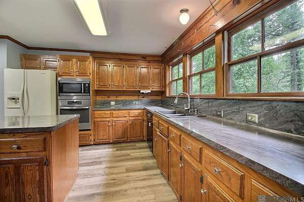 Step inside and feel instantly at home with warm wood finishes and spacious living areas with a layout that is perfect for entertaining family or friends. Huge picture windows greet you in the kitchen offering tons of natural lighting and in the living room, a cozy wood burning fireplace. The primary bedroom and bathroom with additional guest bedroom are located downstairs and upstairs 3 generously sized bedrooms with scenic views and a full bath with skylight. The large sunroom will lead you outdoors to your 2.65 secluded acres with huge wood deck, triple garage, wrap around front porch and plenty of space for whatever you might be dreaming of. There is no HOA, no flood insurance is required and the roof is three years old. Home has never flooded.