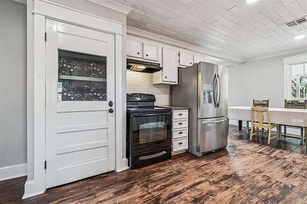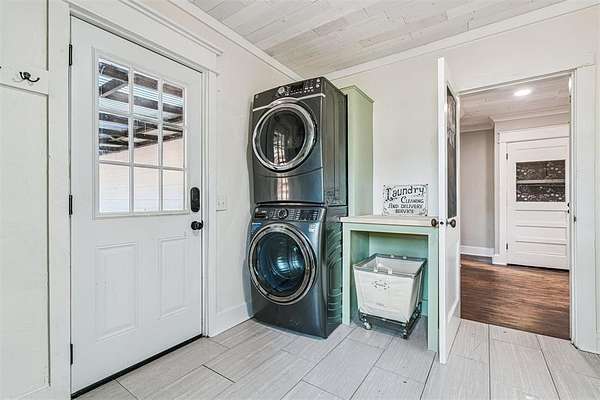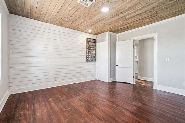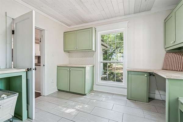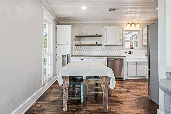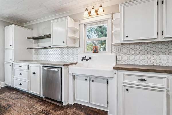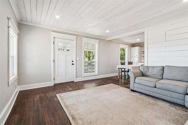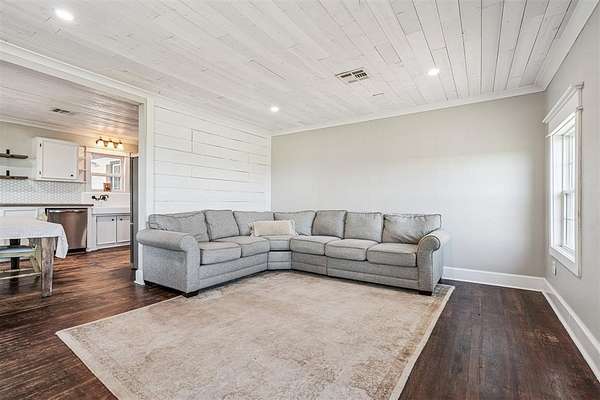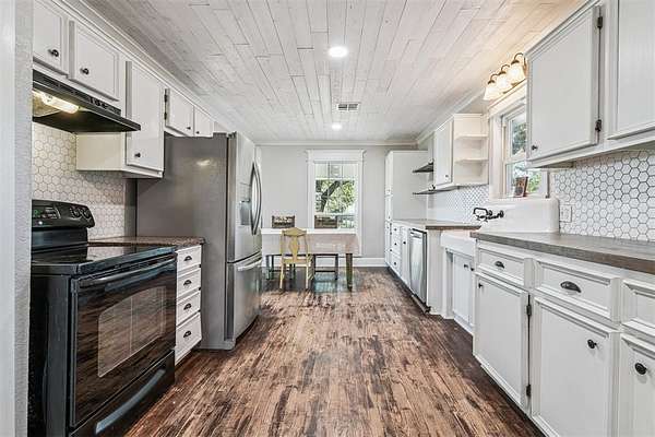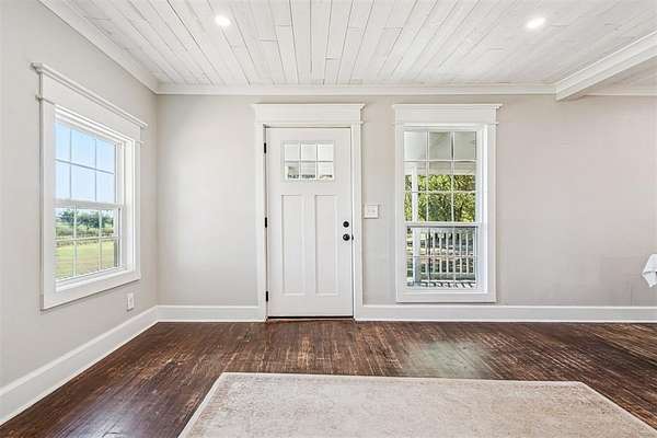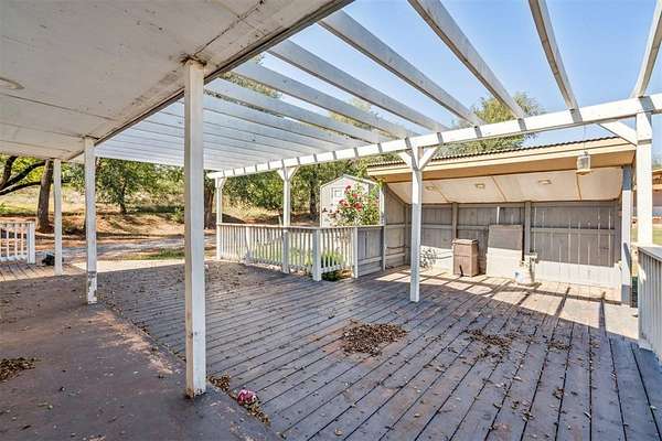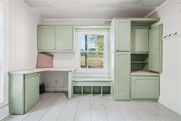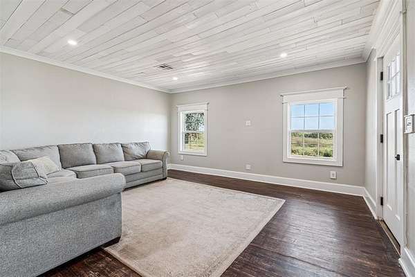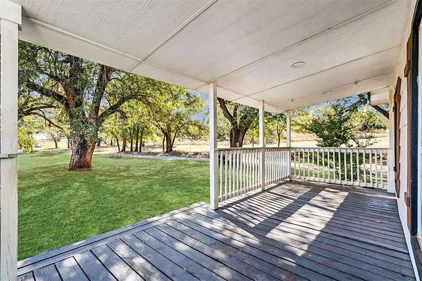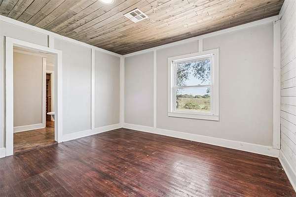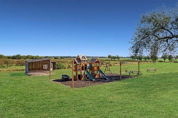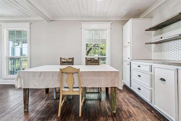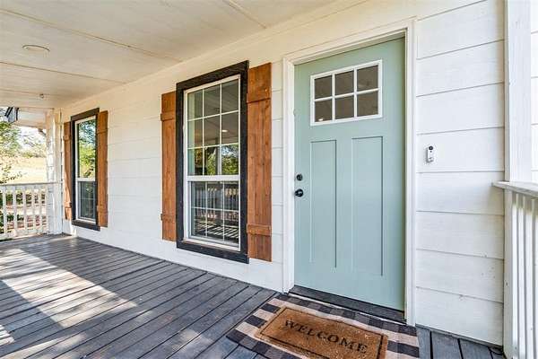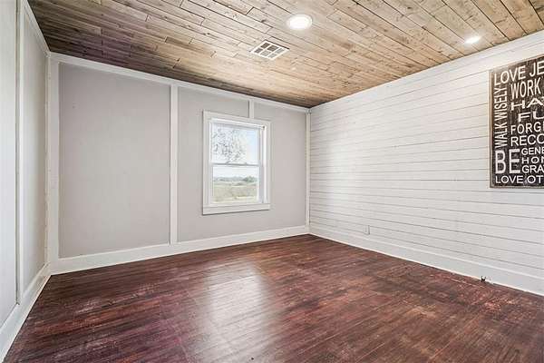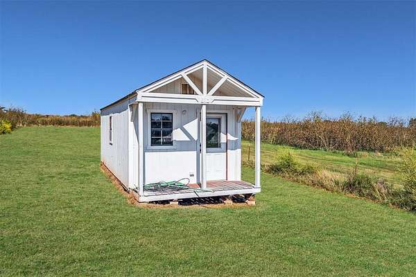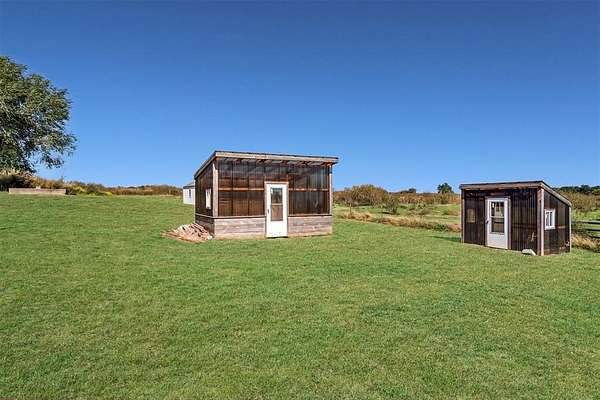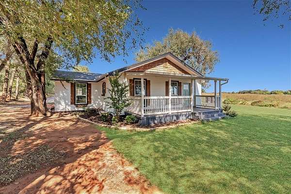 Simply charming and fully updated farmhouse on 6.34 acres in the HA Amber-Pocasset School District! A private drive off a paved road leads you to the home set back for privacy and surrounded by mature trees. The large covered front porch and natural wood shutters add curb appeal and charm. Inside, a spacious living room welcomes you with a shiplap feature wall and ceiling. Original dark-stained hardwood floors flow throughout the home, complemented by freshly painted walls and crisp white trim. New windows fill the home with natural light and showcase scenic views of the property. The dining area opens to the kitchen featuring white cabinetry, good appliances, and an original farmhouse sink. Open shelving provides a stylish spot for your favorite dishes, while a pantry offers space for small appliances or the microwave. The primary suite is a true retreat, continuing the shiplap design for a cozy, timeless feel. The ensuite bath includes a spacious vanity and a beautiful clawfoot tub, while the walk-in closet offers lots of hanging space and built-in shelving. Two additional bedrooms feature built-in loft beds, creating versatile space below for a play area or desk. These rooms share a hall bath with custom tile work in the floor and shower/tub combo. Just outside the bedrooms is a cozy study nook perfect for reading space. Off the kitchen, you'll find the laundry and mudroom with plenty of cabinetry and a built-in desk. It's an ideal setup for a shared office or craft area. A door leads out to the spacious backyard deck, partially covered for year-round enjoyment. Across the property are 3 outbuildings: a 40x60 shop, 15x15(mol) cinderblock building, and a 12x20(mol) structure, plus a chicken coop, clotheslines, and a play set area. If you're looking for even more room to roam, the seller is offering an addt'l 5 acres West adjoining the property, complete with a sm shallow pond! Purchase separately or bundle together totaling 11.34 acres of peaceful country living.