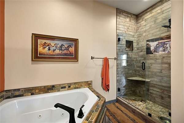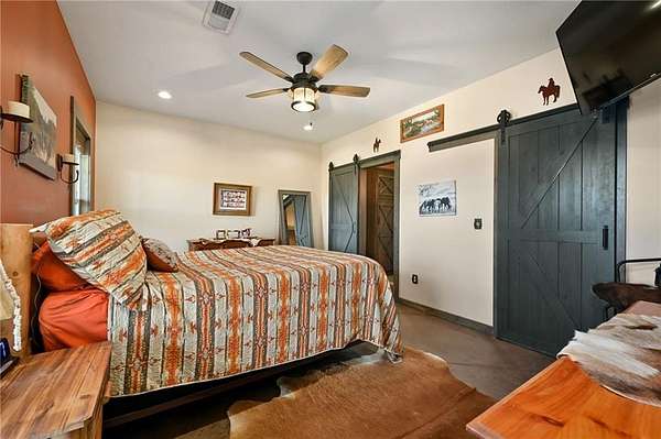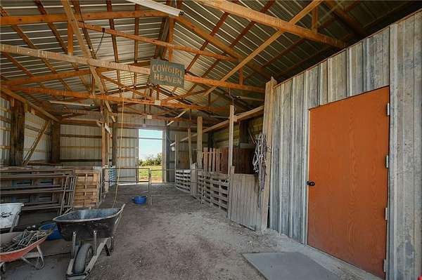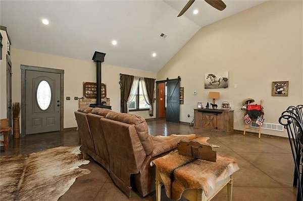 This gorgeous true ranch home on 10 acres offers the perfect blend of quiet country living and modern convenience. Only 4 years young, this home is completely move in ready. From the soaring vaulted ceilings, to the stunning concrete floors, to the impressive kitchen island and custom cabinets, there is so much to love here. Buyers will appreciate more features like walk in closets w/auto lights, the luxurious primary bath, spacious laundry/mud room w/pass through to the primary closet, a new wood burning stove for cozy winter nights, and plenty of natural light and serene views. Enjoy the tranquility and beauty this property has to offer from your covered front porch or covered back patio. Ready for your animals/livestock, the land is fully fenced and cross fenced, featuring a 30x40 metal barn (5 stalls + tack room), a 20x20 lean-to (new tin roof) and chicken coop/run. And with just a few minutes drive to 50 highway, the location is ideal for easy commutes to work or running errands in town. Make this your own little piece of countryside paradise today!
