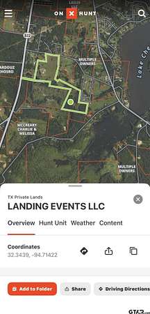 From Gregg county airport: pass airport on 322 headed towards Henderson. Stay straight for about 2.7 miles, then driveway on left. Signs out front say "The Landing"