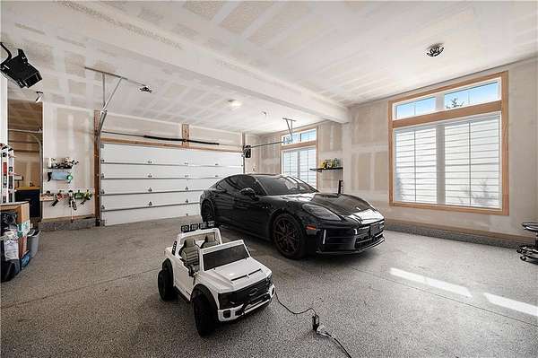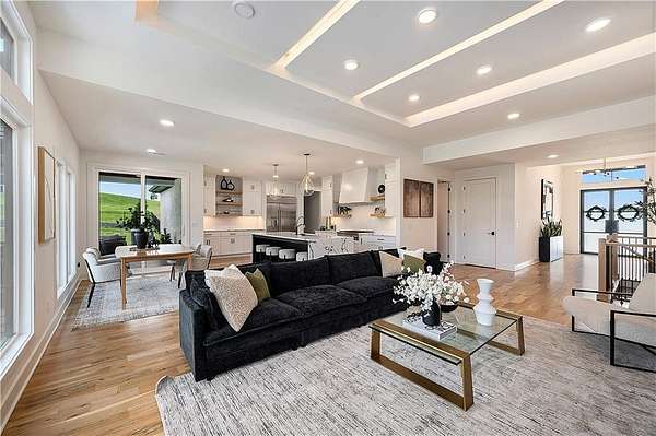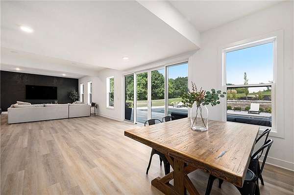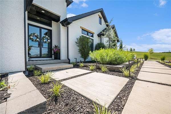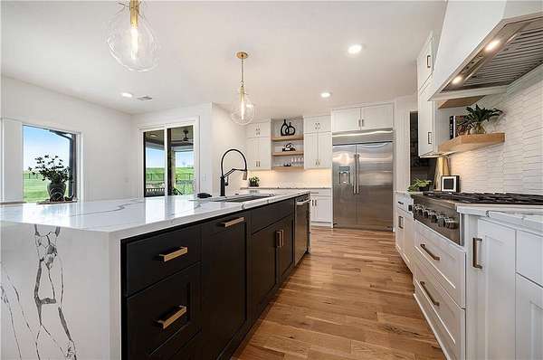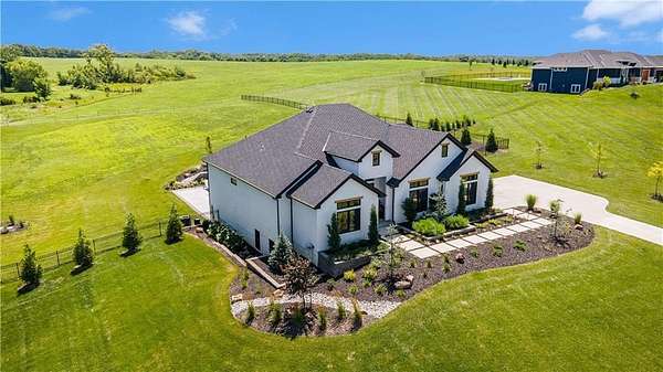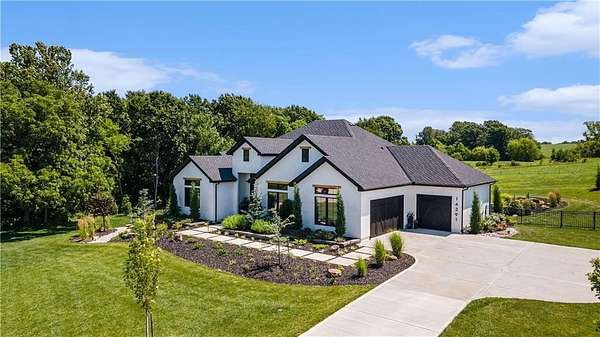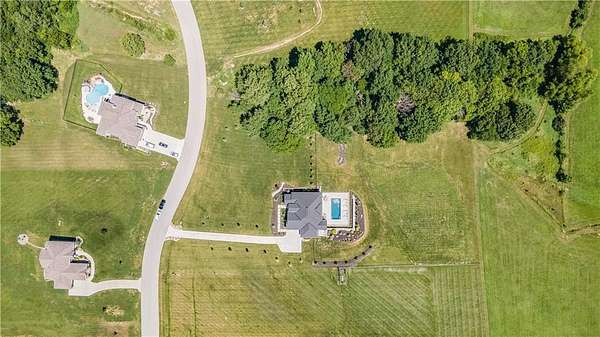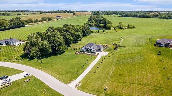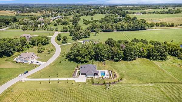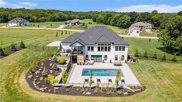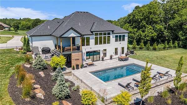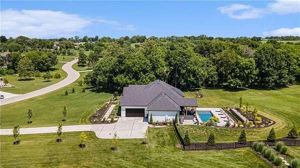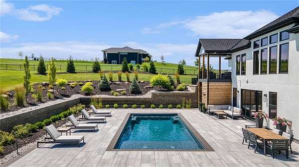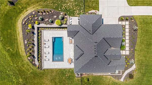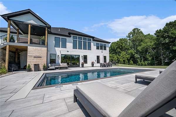 Welcome to this stunning custom reverse 1.5-story home, set on a beautifully manicured 3.62-acre lot. From the moment you arrive, you'll notice the meticulous landscaping, treed-lined driveway, and custom stone path leading to the striking 10' double entry doors. The side-entry 3-car garage features epoxy flooring and adds to the home's clean, modern appeal. Inside, 10' ceilings and hardwood floors run throughout the main level. The east wing of the home was expanded to accommodate spacious bedrooms and an impressive primary walk-in closet. The primary boasts a tray ceiling with ceiling fan, the luxurious ensuite includes a freestanding tub, double vanity, and a walk-in shower. The open-concept living room features a handcrafted ceiling design and a Roman Clay gas fireplace. Black Pella windows provide picturesque views of the backyard and pool, while flooding the living area and kitchen with natural light. No detail was spared in the designer kitchen, complete with a waterfall-edge quartz island, custom cabinetry, tile backsplash wall, wrapped hood vent, floating shelves, and 6-burner gas stove. A coffee bar, butler's pantry, and walk-in pantry add functionality. Downstairs offers an expansive open layout with 10' ceilings, luxury vinyl plank flooring, full bath, full bar and half bath. The show-stopping basement bar features an oversized black quartz island, sink, custom cabinetry, tile feature wall, and floating shelves. Two additional bedrooms and a third full bathroom complete the lower level. The storage room has been converted into a home gym and includes John Deere doors that open to pool deck. Outdoors, enjoy a private oasis with a beautifully landscaped Pinnacle fiberglass 35' in-ground pool, with retractable cover, retaining wall, ambient lighting, and tree-lined east boundary. Convenient pool storage is tucked beneath the deck. This home offers luxury, privacy, and custom craftsmanship at every turn.