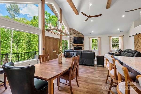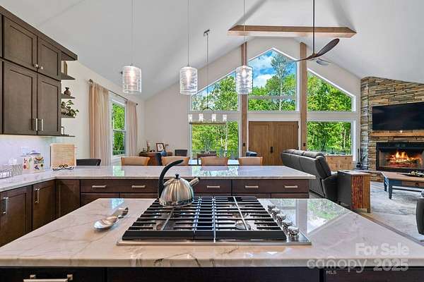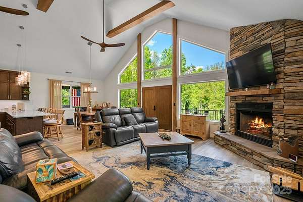 THIS IS MODERN MOUNTAIN LIVING! Beauty and resilience combine in this 3-bedroom, 3-bath, custom-designed home in Hendersonville's Twin Brooks subdivision, complete with large boulders "standing guard." Inside, a magnificent GREAT ROOM encompasses the kitchen, dining and living areas, anchored by a stone fireplace with custom mantle and big windows that bring the outside in. Premium kitchen appliances, countertops and cabinets, cooktop island and large breakfast bar. Primary bedroom suite with roll-in shower, second bedroom, full bath and laundry all on main. Lower level adds a large third bedroom and full bath suite that could become a family room, studio and more. Enjoy the skies from the large wraparound porch overlooking NEWLY GRADED front of property, ready for landscaping, pole barn - you decide! This sturdy home delivers the details, including a waterproof membrane and French drain along the foundation, deep garage, lots of storage, portable generator hookup, dog run, and more.
