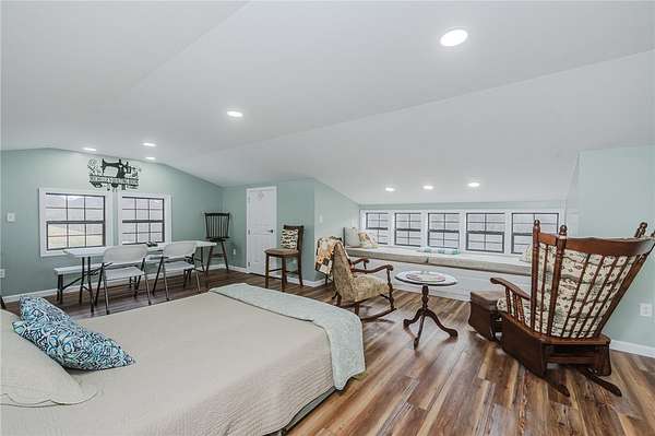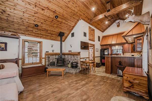 This thoughtfully built newer home offers 2 bedrooms and 2 full baths with exceptional attention to quality throughout, including Superior Walls, Slayer French drains, Pella windows, 30-year architectural shingles, and low-maintenance vinyl cedar shake-look siding. Inside, the home is rich with warmth and character, featuring soaring 18-foot tongue-and-groove ceilings, recessed lighting, hard-wired window candles, a maple mantel, and a wood-burning Vermont Castings fireplace.