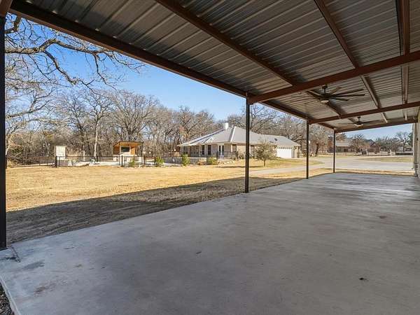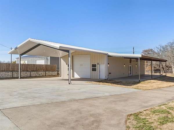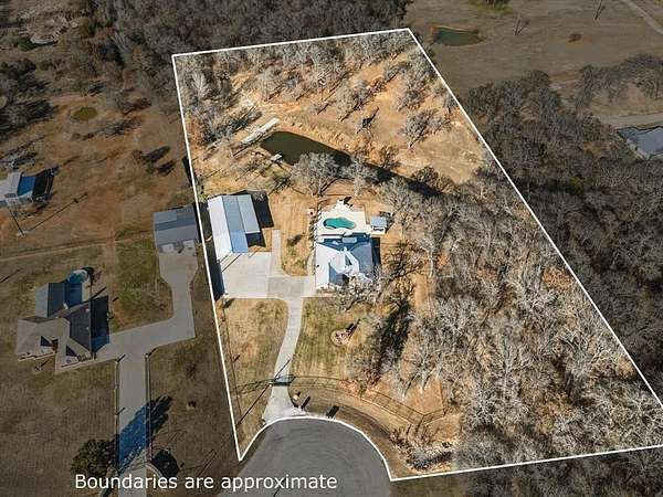 Escape to the country without sacrificing the comfort of being close to town on this exceptional ~4.91-acre property in Springtown ISD. Enjoy the savings of a Unincorporated Tax Rate. Fully fenced and secured with an automatic gate, this private retreat offers the outdoor living activities you've desired around your resort-style pool-cabana-fireplace. An approximate 30 x 60 shop with spray foam insulation, climate controlled and is ideal for hobbies, storage, or projects, while a water well, storm shelter, and private stocked pond add both convenience and peace of mind. Large porch attached to shop allows shade in the afternoon and additional covered parking for your large vehicles, tractor, or trailers. Inside this single-story home, ceramic tile flooring flows throughout the common areas providing easy maintenance and durability. Fresh neutral paint and carpet make this one ready to move into. The inviting central living space centers around a cozy wood-burning fireplace and flows seamlessly into the kitchen, which features granite countertops, stainless steel appliances, an eat-at bar, and a sunny breakfast area. The spacious primary suite is a true sanctuary, offering private backyard access and an oversized en-suite bathroom complete with dual sinks, a garden tub, and a separate shower. Secondary bedrooms are generously sized and all have ceiling fans. Standing metal seam roof is striking and durable! Step outside to an entertainer's dream backyard showcasing an elevated deck, stone retaining wall, in-ground pool, stone fireplace, and outdoor kitchen--perfect for hosting gatherings or enjoying peaceful Texas evenings. With room to roam, work, and relax, this property delivers the best of country living with modern amenities while being reasonable size to effectively maintain. Hard to find all of these amenities at this price point within close proximity to town!
