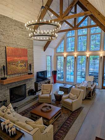 This fine estate property is perched on a shelf of Big Sheepcliff mountain, in the close to town and highly desirable Cedar Ridge Estates neighborhood. End of the road privacy and a large double lot offer a wonderful setting for exceptional and extensive year 'round gardens. A very wide covered front porch serves as access to the front door, mudroom door and connector to the two car garage. A stunning surprise greets when stepping into the great room; the dramatic rock face behind the house which provides home to peregrine falcons creates a knock-out focal point for the great room's wall of windows. There is excellent flow between the great room with a tall stack stone gas log fireplace, the large kitchen and the Carolina Room with stone wood burning fireplace and grilling area. Primary suite has a large bath, two spacious closets and cathedral ceiling. On the opposite side of the home are two charming ensuite bedrooms, both with lovely views to the outside. Finishing off the main level is an office-den near the entry, bar alcove, powder room and outstanding laundry/pantry/office combo. Two carpeted rooms upstairs can be finished off as additional sleeping quarters, or kept as bonus space, and there is a wonderful guest suite opportunity with stubbed out plumbing and electricity above the garage. This home is bright, current and extremely well maintained.