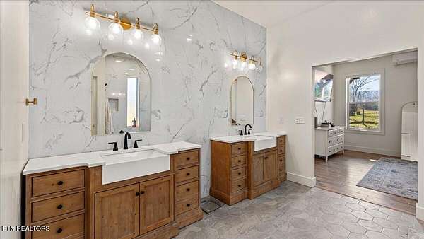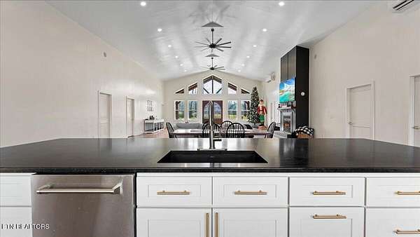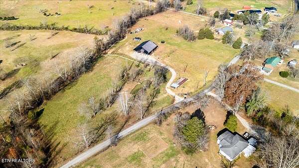 Completed in 2025, this custom barndominium-style, stick-built home sits on 5.79 flat acres just about 15 minutes to Oak Ridge and 30 minutes to Knoxville. A long, curving driveway brings you roughly 400 feet off the road to a private homesite with a pond, open pasture and a year-round creek along the side property line. The black metal exterior with timber-frame front porch gives the home instant curb appeal. Inside, there is approximately 3,600 sq ft with a dramatic 16' vaulted great room, 10' ceilings in every bedroom and tall exterior doors that keep the main living areas feeling bright and open. The kitchen is the centerpiece of the home with an oversized 13' island, ZLINE gas range and appliance package, custom cabinetry and a true walk-in pantry, all open to the great room for easy entertaining. The primary suite offers a large walk-in closet and custom tile shower, plus three additional bedrooms (four total) and 2 1/2 baths for family, guests or home office needs. A simple concrete back patio off the main living area creates a spot for grilling or morning coffee. The home also features an oversized 400-amp electrical service, ideal for future shops, RVs or additional equipment. Two versatile structures behind the home can serve as chicken coops, storage or workshop space, and there is an additional barn-style structure near the front of the property for animals or equipment. The home is served by city water and septic, with no HOA and low Roane County taxes.