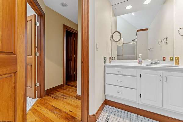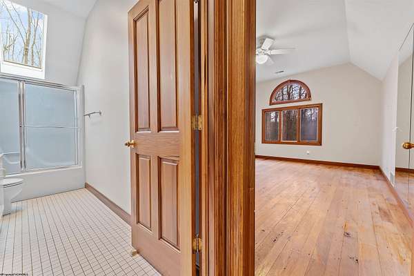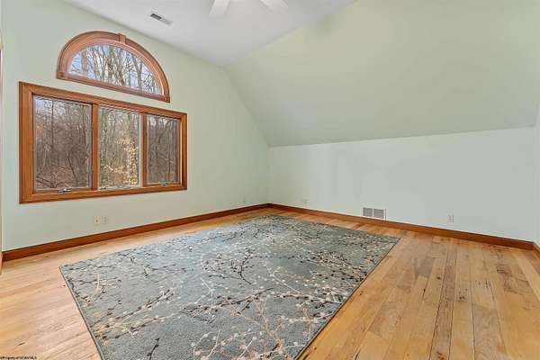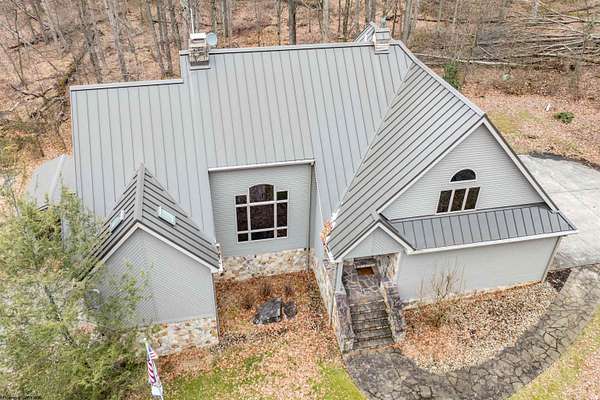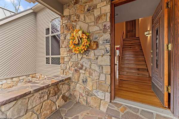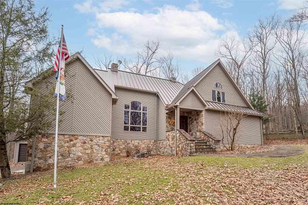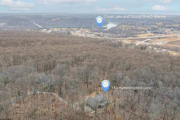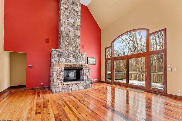 Very rare opportunity to own a private retreat on 16 wooded acres just minutes from Cheat Lake. This stunning home offers peaceful seclusion with established hiking trails winding throughout the property. Inside, you'll find spacious first-floor primary suite featuring dual bath suites, step-in closet, and a cozy fireplace. The dramatic vaulted ceilings, and massive stacked-stone fireplace, skylights, and walls of windows fill the home natural light and showcase the beautiful hardwood floors. The open kitchen flows seamlessly into a solarium-style dining area, creating the perfect space for everyday living and entertaining. Large bedrooms, first floor laundry, and abundant storage add convenience and functionality. Step outside to enjoy the expansive deck complete with a hot tub - ideal for relaxing and taking in the serene surroundings.