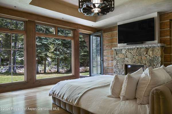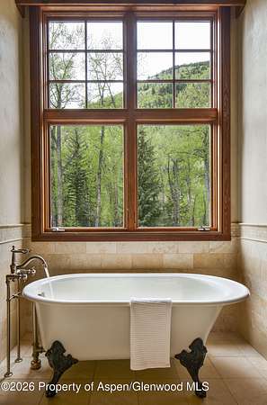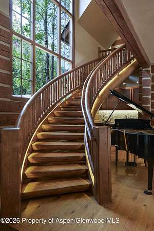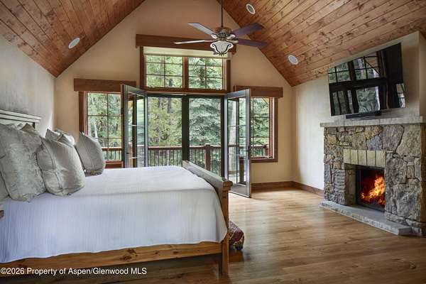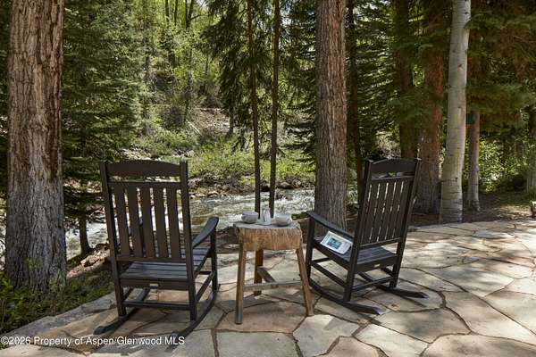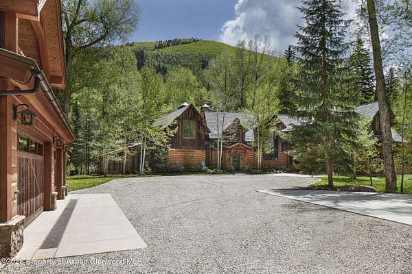 Set along the banks of picturesque Castle Creek, this remarkable Aspen retreat captures the splendor of the water as it rolls through the landscape, creating a serene and enchanting backdrop. Spanning 2.45 acres of gentle and flat terrain, the property offers a sense of privacy and tranquility just minutes from downtown. Impressive mountain architecture blends wood and stone elements with a timeless interior. Designed with a connection to the outdoors as the inspiration, the home features five bedrooms, including a main level primary suite with a gas fireplace and spa bath, and four additional guest bedrooms upstairs. Nearly every room enjoys captivating views, with most oriented to embrace the river. At the heart of the home, a lofty great room flows into the open dining area and kitchen, while a sunlit breakfast nook creates a relaxing place to begin each day. These living spaces open effortlessly to the outdoors, positioned close to the water's edge, an irreplaceable feature no longer permitted under current building codes. A detached garage could house up to six cars and ample gear storage, complete with an adaptable space upstairs that includes a kitchenette and bath. The Castle Creek Valley provides the ultimate home base for those that crave the best of the Colorado lifestyle. A beautiful hideaway in nature nearby recreation and schools, and only a few miles to the world class cultural and nightlife amenities of Aspen.