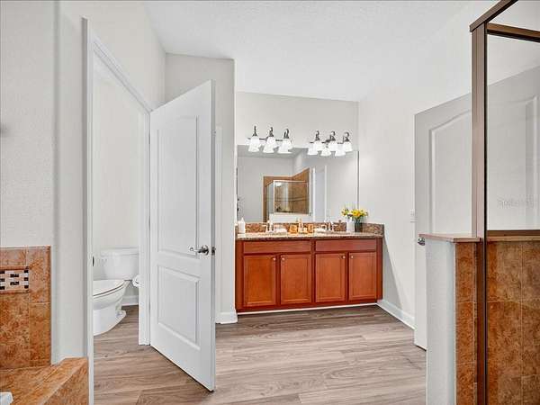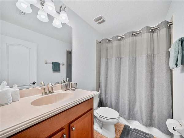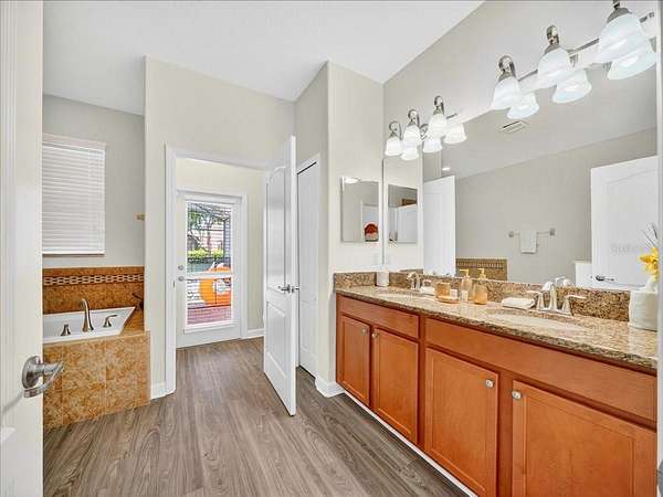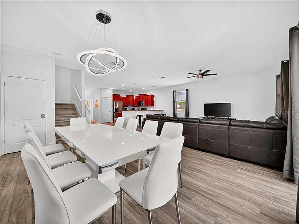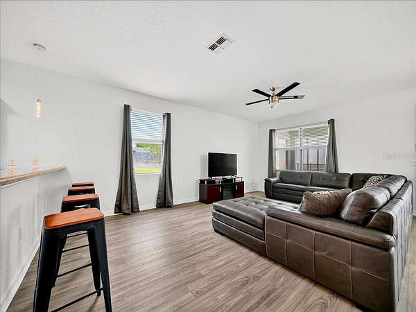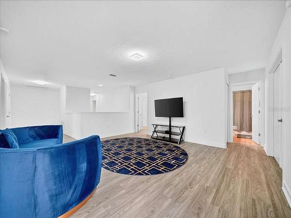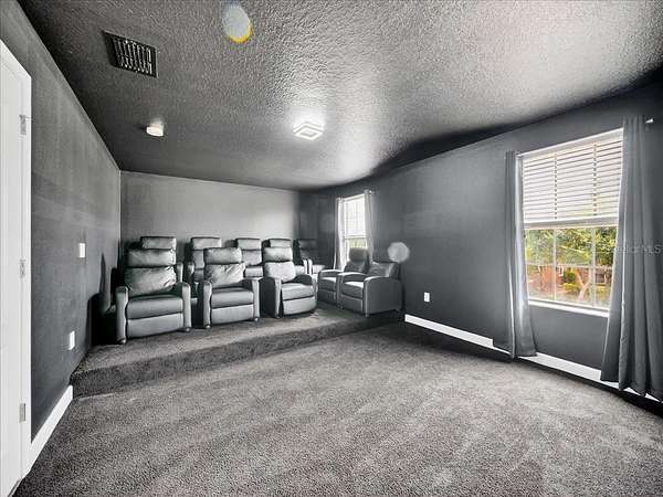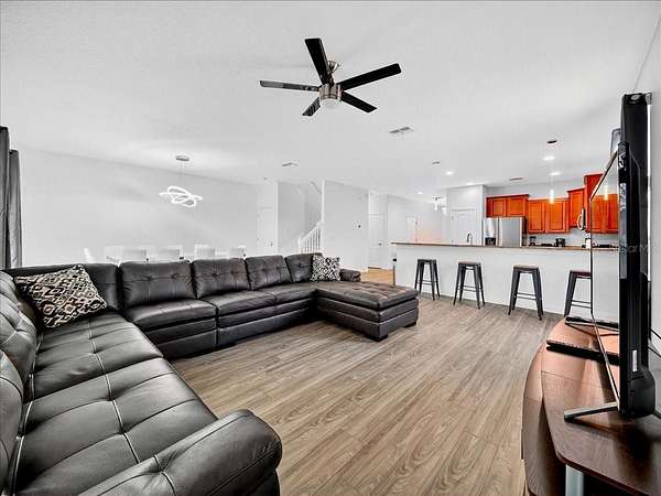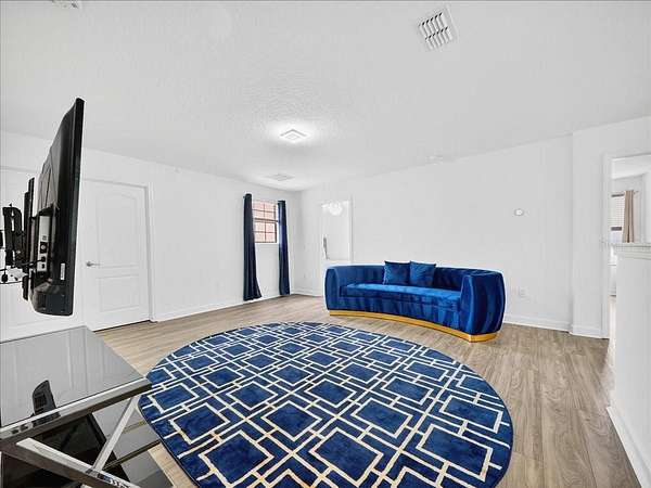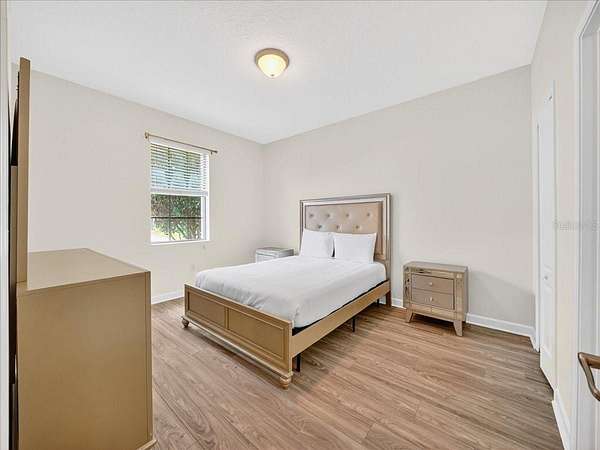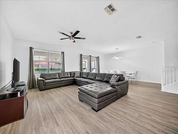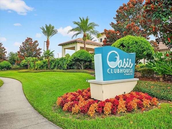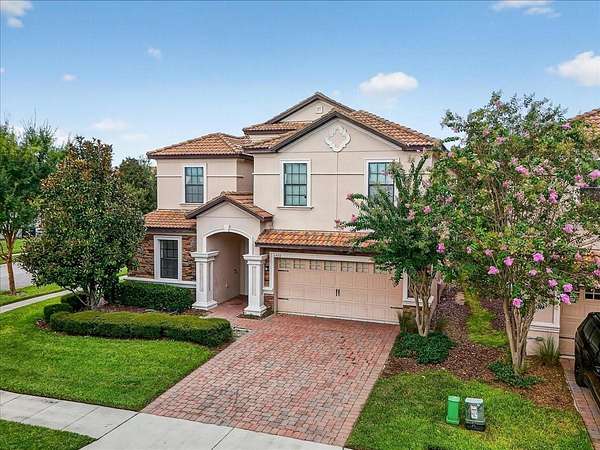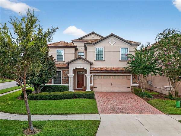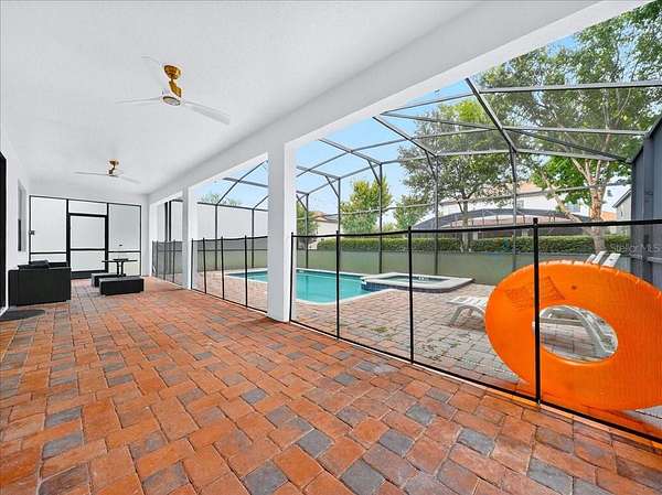 This home is freshly renovated with new floors throughout, fresh paint, and luxury furniture throughout. Appliances and furniture both NEW and included. There is so much you can do in this resort styled man-gated community. This community comes with options, make this your home away from snow or add it to your income generating portfolio! You have the opportunity to own a Vacation Home with 8 bedrooms, 5 bathrooms, a converted garage for gaming, and a theatre room! A private pool fully screened in the back, along with a spa, and no carpet throughout. The home is a fresh start, unlike the rest. No wear and tear and properly managed. A corner lot located in Champions Gate with views of the golf course and walkable distance to the oasis club which has dining, events, resort style pools and more!