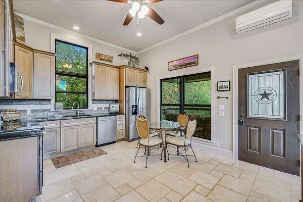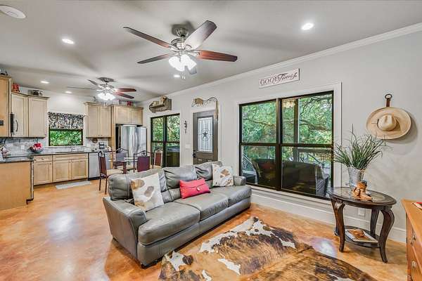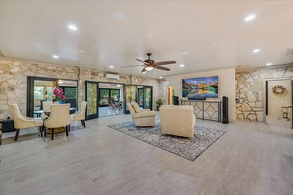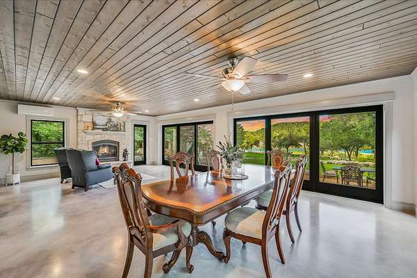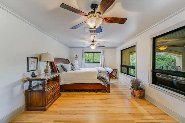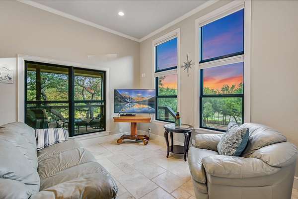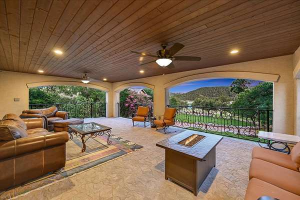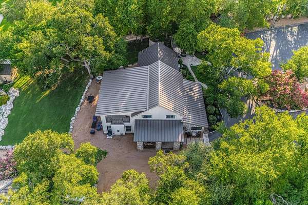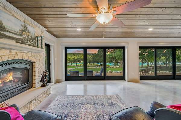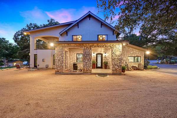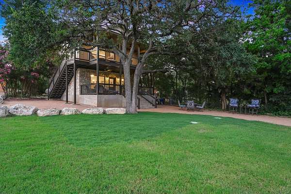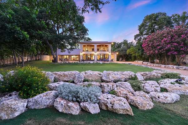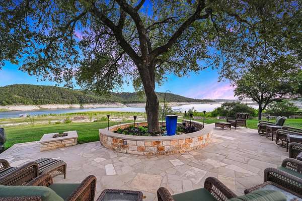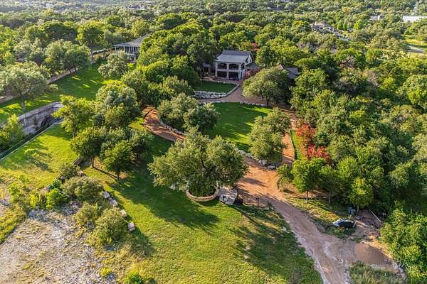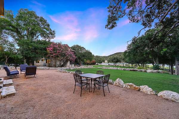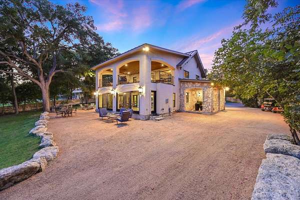CONTACT AGENT #2: Josh/512-845-5423 for a showing or questions. A rare opportunity to acquire one of the most distinctive waterfront estates on Lake Travis. Set on 2.26 landscaped acres with a gradual slope to deep water and 222 feet of private shoreline, this multi-structure compound was designed for generational living, elevated entertaining, and lasting legacy. The primary residence spans 3,387 square feet (3 bedrooms, 2.1 bathrooms) and features refined Hill Country architecture, expansive window walls, and seamless transitions between indoor and outdoor living spaces. Views stretch across the lake from nearly every vantage point, with upper balconies and covered patios positioned to capture morning light and sunset color. In addition to the main home, the property includes two 724 sf guest houses, both with full kitchens (4 bedrooms, 2 full baths), a 238 sf casita with kitchenette (1 bed, 1 full bathroom), and a 225 sf studio/salon - each thoughtfully sited and privately accessed. Whether hosting extended family, providing long-term accommodations, or creating dedicated workspaces, the layout offers exceptional versatility with no compromise in design or privacy. As you enter through the beautiful stone and large privacy gate - the grounds are curated, not just maintained - mature oaks, manicured lawns, and native stone pathways lead to multiple gathering areas, including a firepit lounge and waterfront viewing decks. A short walk or golf cart drive to the private boat dock down the gradual slope to your private dock and covered boat slip with HydroHoist completes the experience. Don't miss this amazing opportunity to own one of the rarest properties on Lake Travis. With a enough yard space to add your own private pool/spa (rendering available) and driveway space to expand the garage to accommodate up to 4 car garage - this property is a true must see to believe. A true hidden oasis on Lake Travis!