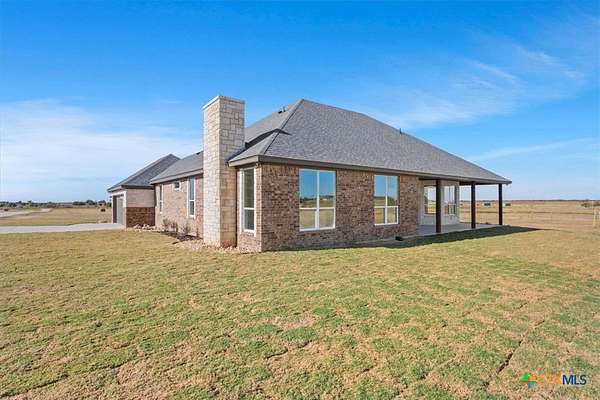 Welcome to this stunning NEW home, beautifully nestled on 17 acres just outside Temple-where you'll enjoy the benefit of NO CITY TAXES. This property masterfully blends modern elegance with country warmth, featuring 3 spacious bedrooms, 3.5 luxurious bathrooms, 2 dining areas, and a dedicated office with double glass doors, all within a generous 2,726 sq/ft layout. Step inside to a thoughtfully designed open-concept floor plan, highlighted by two impressive living spaces and a cozy stone gas fireplace-perfect for relaxing on cool Texas evenings. The gourmet kitchen is just one of the home centerpieces, offering custom cabinetry and two adjoining dining areas, all finished with high-end, elegant surfaces. Retreat to the expansive primary suite, complete with an en-suite bathroom featuring double vanity sinks, a grand walk-in shower, a soaking tub, and dual closets. The additional bedrooms are generously sized and share a stylish Jack-and-Jill bathroom for added convenience. Step out onto the Texas-sized back patio, where an extra full bath awaits-ideal for future plans like a pool, hot tub, or just an extra amenity for outdoor entertainment. Soak up the breathtaking views of rolling countryside and seize this rare opportunity to own your slice of Texas country living.