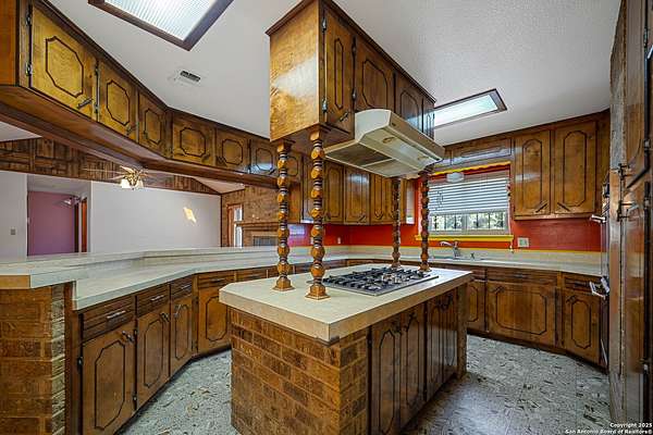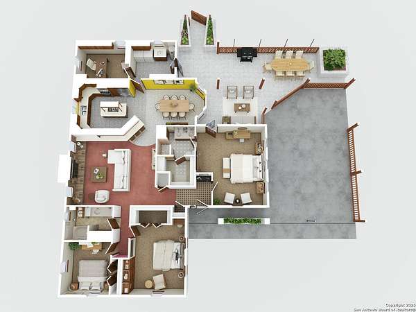 This spacious home features an open-concept design with a large kitchen that includes a bright yellow island or peninsula. The kitchen flows into a dining area and connects to a living room space in an open floor plan. The house contains 3 bedrooms of varying sizes and 2 bathrooms positioned throughout the home for convenient access there is also a home office or study room. One of the major features is the extensive outdoor living space, which includes a large, covered patio or deck area and an additional open patio space. These outdoor areas significantly expand the usable living space and are ideal for entertaining or relaxation. The design emphasizes good flow between rooms and excellent indoor-outdoor connectivity. The layout balances private spaces (bedrooms) with open common areas, and the substantial outdoor spaces are seamlessly with the indoor living areas. This is a well-planned family home that maximizes both indoor space and outdoor living potential. This 12 acre property also includes a large shop, water well, and infrastructure for a 50 slot RV park. On the south East side of the property there is 50 power connections in place from a previous RV park. Power is not in place but all infrastructure is.