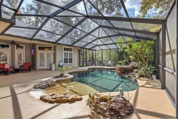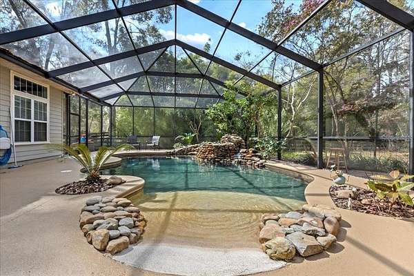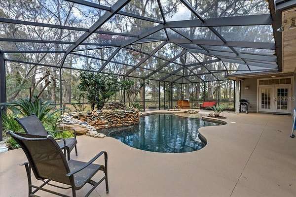 Outdoors, enjoy a screen-enclosed pool with extended deck and covered lanai, perfect for year-round use. A paved circular drive, side-entry 3-car garage, and fenced 1.78-acre lot deliver privacy under mature oaks with no rear neighbors.