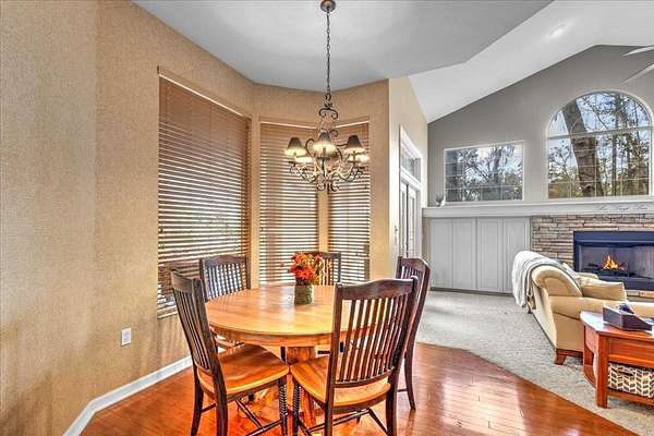 Interior features include high ceilings, a stone-accented fireplace, open living and dining areas, and a large kitchen with island seating, pantry, and excellent prep space. The main-level primary suite provides direct pool access, dual closets, and a spacious bath. Three additional bedrooms plus an upstairs suite make this layout ideal for guests or multi-generational living.