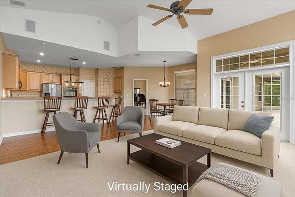 - Cathedral Ceiling(s), Ceiling Fans(s), Crown Molding, Eat-In Kitchen, High Ceilings, Kitchen/Family Room Combo, Open Floorplan, Primary Bedroom Main Floor, Solid Wood Cabinets, Split Bedroom, Thermostat, Tray Ceiling(s), Vaulted Ceiling(s), Walk-In Closet(s), Window Treatments