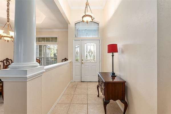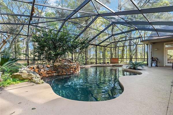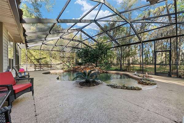 One or more photo(s) has been virtually staged. Situated within the gated Steeplechase Farms community, this 5-bedroom, 3 full and 2 half-bath custom home offers over 4,100 square feet of living space on 1.78 private acres. Major updates have already been completed, including a new roof (2024), HVAC (2021), and water heater (2020), providing added peace of mind. The interior features high ceilings, a stone-accented fireplace, and open living and dining areas, along with a spacious kitchen offering a large island, pantry, and ample prep space. The main-level primary suite includes direct pool access, dual closets, and a generous en-suite bath, while three additional bedrooms and an upstairs suite provide flexible living options for guests or multi-generational needs. Outdoors, enjoy a screen-enclosed pool with an extended deck and covered lanai, all set on a fully fenced lot shaded by mature oaks with no rear neighbors. A circular paved driveway and side-entry three-car garage add both function and curb appeal, all just minutes from Newberry, Tioga, Publix, and UF/Shands.