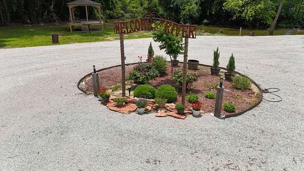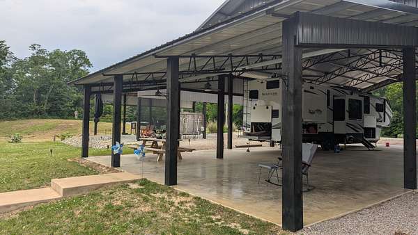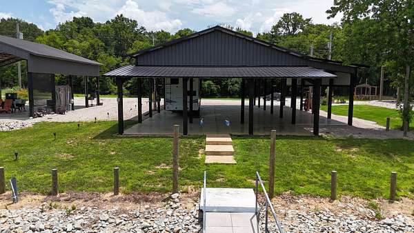 The A-lot features a massive, custom-built pavilion with 8x8 posts and an all-steel roof system, including steel trusses and purlins for unmatched durability. The structure offers expansive covered space, including a 34' x 60' main roof, 12' x 60' lean-to along the side, and a 14' x 34' gabled lean-to facing the lake—perfect for outdoor living, entertaining, or full-time RV use. A large finished concrete pad easily accommodates your RV, with room to spread out and take in the view. There is Fiber Internet and full hookups on both sides of the pavilion to bring in a second RV for friends.