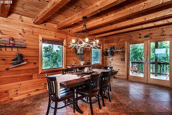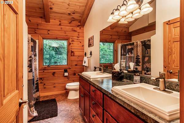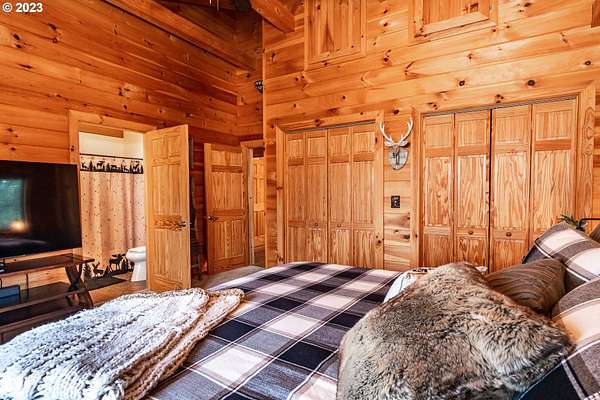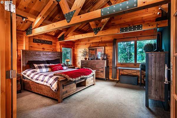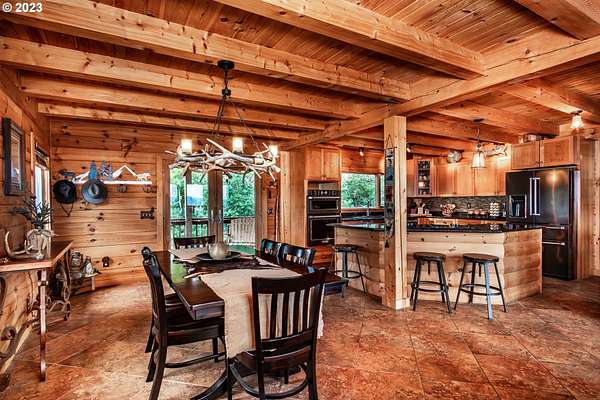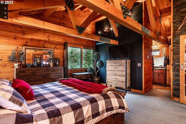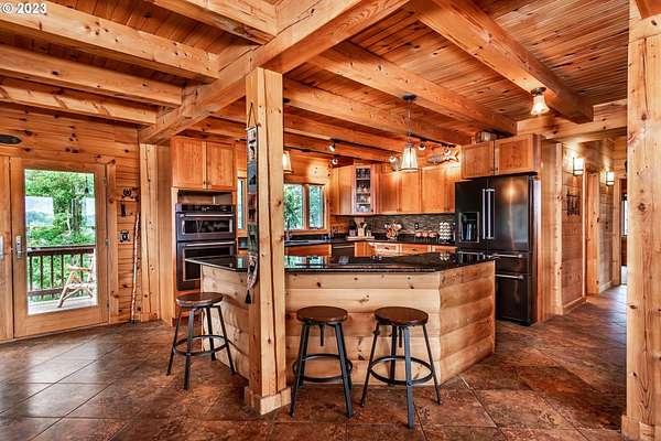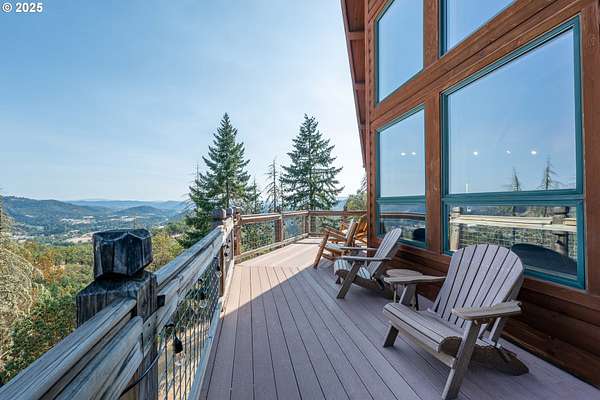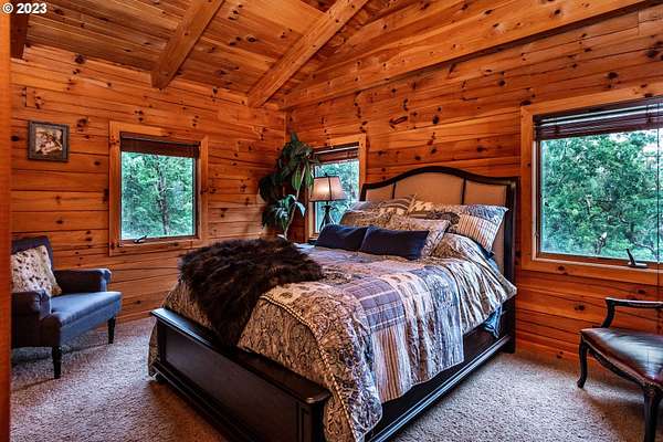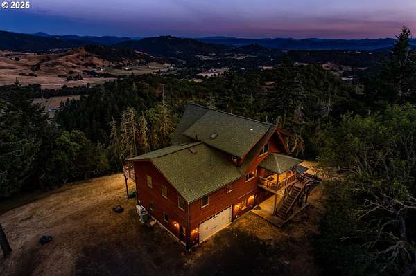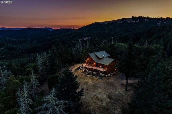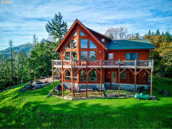 Rich timber finishes enhance this exceptional estate, setting it apart from typical log cabins. Experience unparalleled luxury and privacy at 1435 Wilbur Rd, Roseburg, OR-an exquisite luxury log home nestled on 80 pristine acres of serene woodland. This masterfully crafted residence blends rustic elegance with sophisticated design, featuring soaring 28-foot ceilings, exposed beams, and expansive Anderson windows that flood the space with natural light and showcase breathtaking panoramic views from nearly every room. The gourmet kitchen boasts top-of-the-line stainless steel appliances, perfect for culinary excellence. Two lavish primary suites offer ultimate comfort: the main suite on the third level includes a luxurious soaker tub and tile shower, while the second suite on the second level opens to an expansive deck ideal for stargazing in complete privacy. The bottom level impresses with elegant slate tile flooring, a refined family room with a pellet stove, and premium surround sound for an immersive experience. Outside, enjoy abundant wildlife, premier hunting grounds, timber resources, ample RV parking, an extra-deep two-car garage, and a luxurious hot tub beneath a new pergola. With Farm Forest tax exemption, low property taxes, and reliable Umpqua Basin water, this estate offers exclusivity, natural beauty, and refined living-perfect for the discerning buyer seeking a private sanctuary with unmatched elegance. Your extraordinary lifestyle begins here.