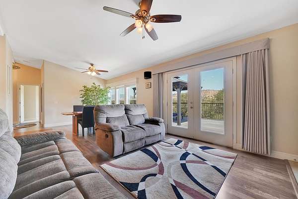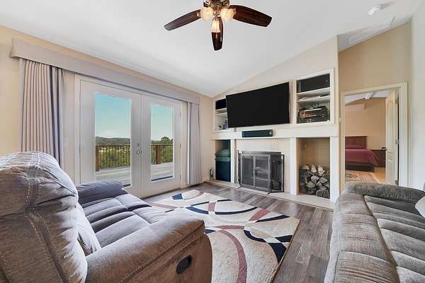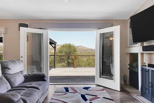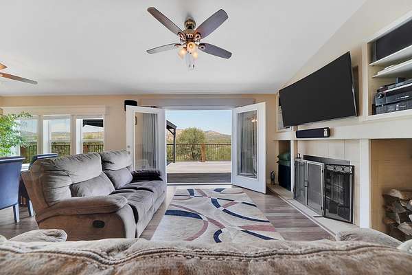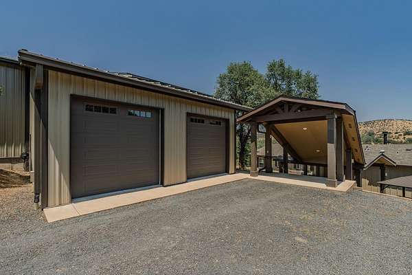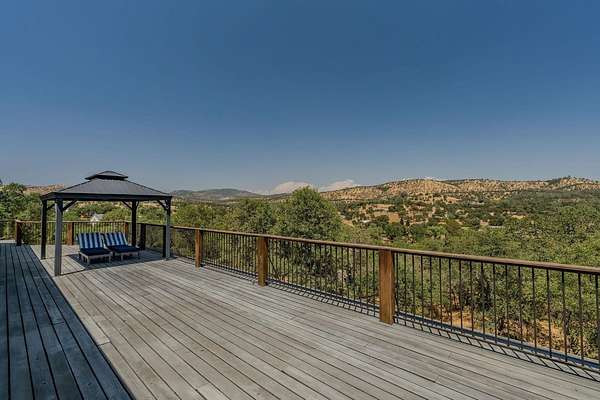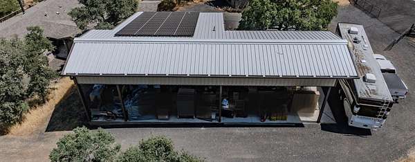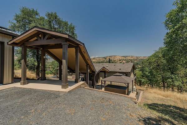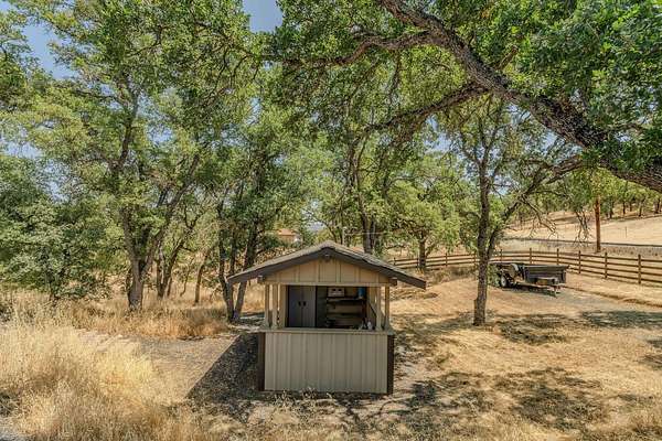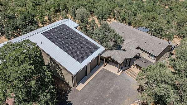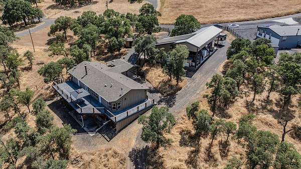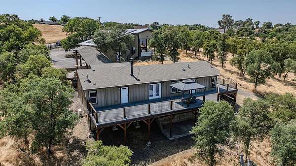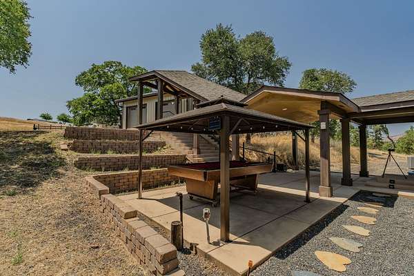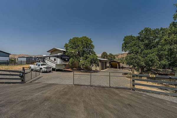 This down-to-earth ranch-style retreat is a dream come true for car lovers, RV owners, and anyone who needs room to roam. Set on 2.7 fully fenced and cross-fenced acres with sweeping mountain views from the huge deck (approx. 950sqft), this 3-bedroom, 2-bath single-level home with gated entrance offers the perfect blend of utility and comfort in the Copper Cove community near Lake Tulloch. The approx. 1,782sqft home features an open floor plan with a cozy wood-burning fireplace, a large entertaining deck, and a covered gazebo plumbed for a hot tub with power and water in place ideal for relaxing after a long day in the shop or on the trails. Easy gate access from the back of property to Black Creek Park equestrian trails and arena. For the gearhead or serious hobbyist, the property boasts an upper double garage (approx.750sqft.) capable of fitting two car lifts, complete with built-in cabinetry, an EV charging station, 220v and a bathroom with dog wash. An additional insulated lower garage/workshop (approx. 480sqft.) or even used as a barn, features a 10-ft roll-up door and extensive shelving-ready for projects of any scale. Two more covered carports provide even more parking or storage space. RV owners will love the oversized 70-ft covered carport (approx. 1400sqft.) with a 14-ft ceiling and full hookups, including water, power, and sanitary connection. Whether it's a Class A motorhome, a fifth wheel, or all your toys, this setup is ready to go. Under roof approx 4,346 sqft. What an amazing deal! The owned solar system provides a net-zero electric bill, and the board-and-batten exterior complements the rugged, natural setting. And for those with animals, the fencing and cross-fencing offer ideal conditions for horses or livestock. Located in the desirable Copper Cove Association, residents enjoy access to Lake Tulloch via Kiva Park with a boat launch, day-use docks, swim area, and BBQs, as well as Blackcreek Park featuring horse trails, an arena, playground, sports fields, and more. Whether you're restoring classics, hitting the lake, or saddling up for a ride, this property has the space, utility, and setting to support it all.