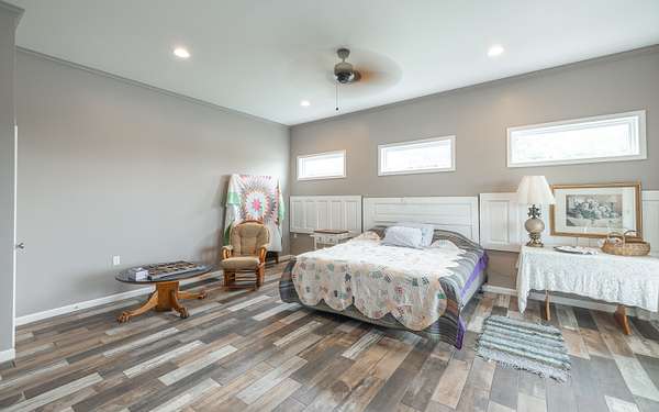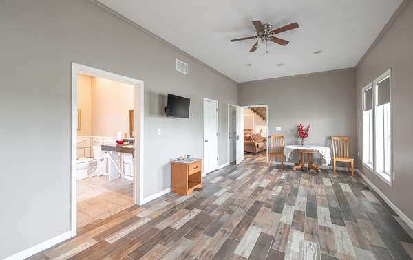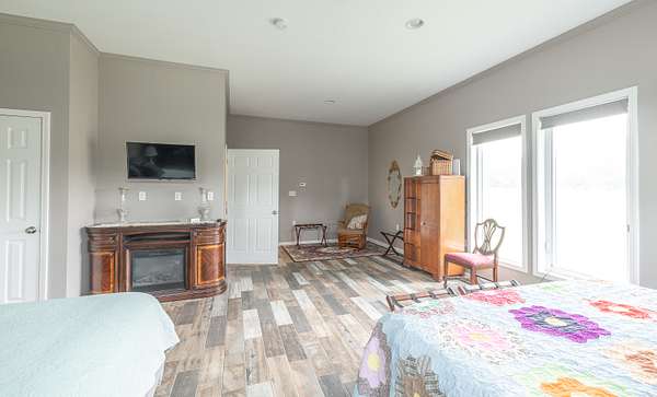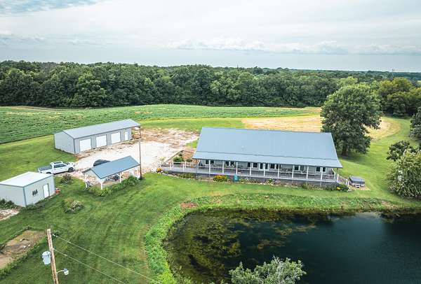 Drive through the gates and follow the lane as it opens to a breathtaking view a beautiful home across the water, perfectly framed by a 3/4 -acre stocked lake. This 47-acre property offers a harmonious mix of fertile cropland and mature woods, with farmland that can be leased for income and timberland that's ideal for hunting. Surrounded by rich agricultural fields, these woods are home to trophy-class North Missouri bucks and abundant wild turkey. The stunning 5-bedroom, 6-bath residence boasts an 80-foot covered front porch overlooking the lake, where you can watch large fish swimming just below the surface. Inside, an open-concept living and dining area with a cozy fireplace flows into a chef's kitchen featuring custom cabinetry, quartz countertops, and an impressive 6' x 12' island -- perfect for gatherings. A large walk-in pantry with ample shelving keeps everything organized, and the master suite includes a whirlpool tub for relaxing after a long day. Previously used as a vacation rental, the home is equally suited as a private retreat or full-time residence. The property also includes two productive garden spots with rich, loamy soil, a pavilion by the lake, a three-car detached garage with workshop, and an additional carport. Located just 8 miles from the Mississippi River and Fenway public access, this property offers both seclusion and convenience -- a rare opportunity for those seeking beauty, recreation, and income potential all in one.