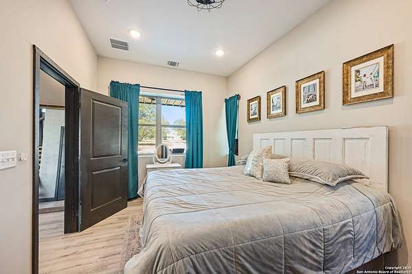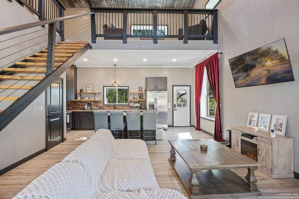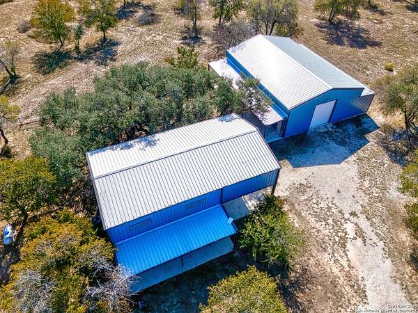 Welcome to a truly unique, custom estate on 7 lightly restricted acres in Natalia, TX, perfectly blending industrial style with country acreage. This one-of-a-kind property centers around a striking, steel-framed home plus an unparalleled 3,000 sq ft detached workshop/garage, all set beneath a canopy of majestic, mature Live Oak trees. The residence invites you in through double front doors to a family room featuring a 20-foot ceiling and an impressive floating Oak staircase leading to the loft and secondary bedrooms. The open-concept kitchen boasts granite countertops, anti-slam cabinets, a gas range, and unique live-edge shelving, making it a natural gathering spot. The entire property is engineered for efficiency, with both the house and the enormous 50'x60' workshop insulated with spray foam. The workshop is a hobbyist's dream, featuring its own 200-amp panel, three large roll-up doors (including a 14'x10'), and is rough-plumbed for a future bath. Outside, multiple entertaining spaces include a covered patio with an outdoor kitchen and a fenced backyard. For guests or potential income, the acreage includes two dedicated RV spots fully equipped with 50-amp power, water, and septic hookups. Don't miss this opportunity for unmatched space, energy efficiency, and flexibility.