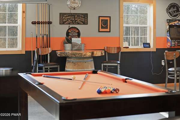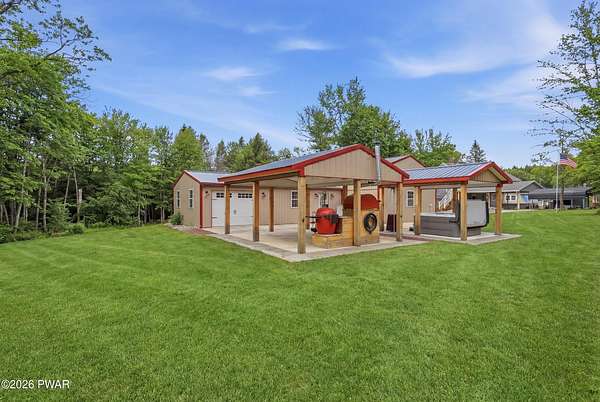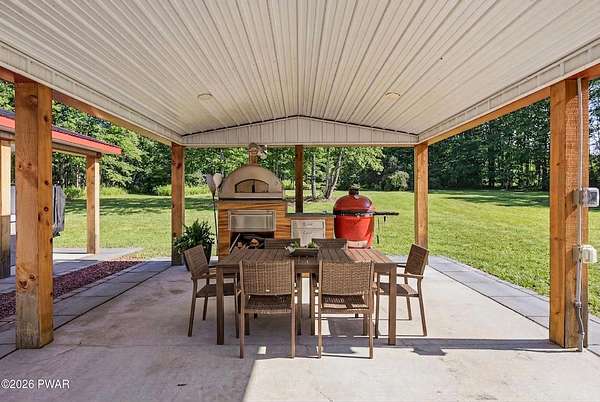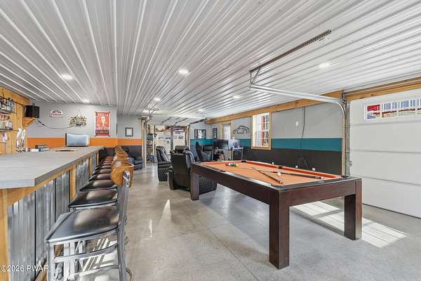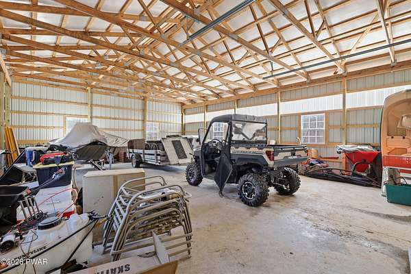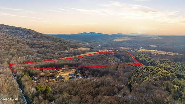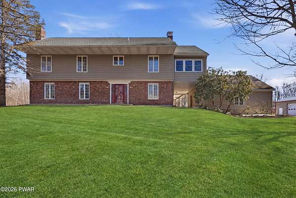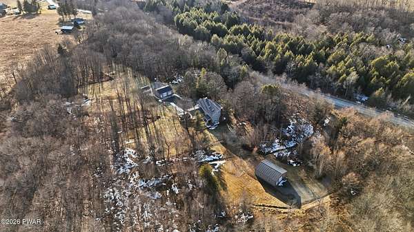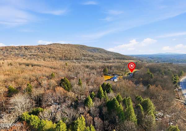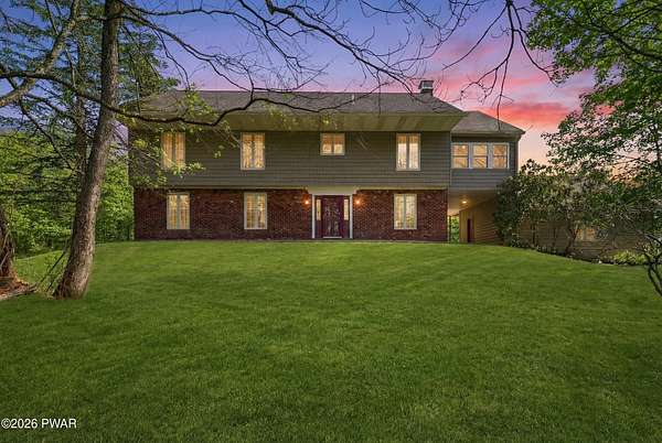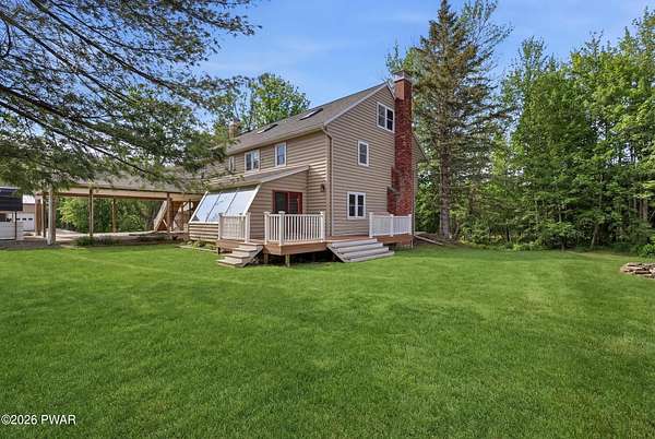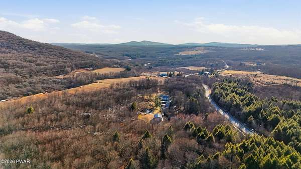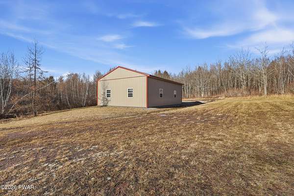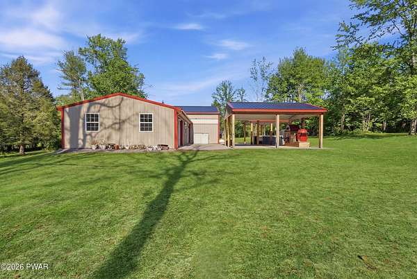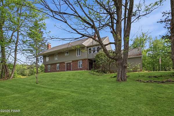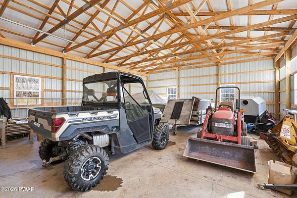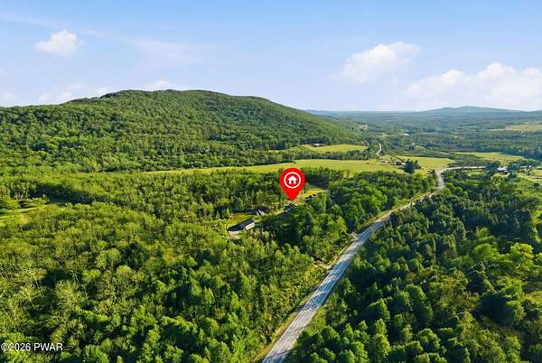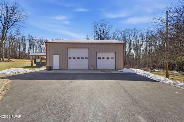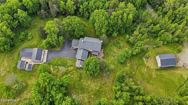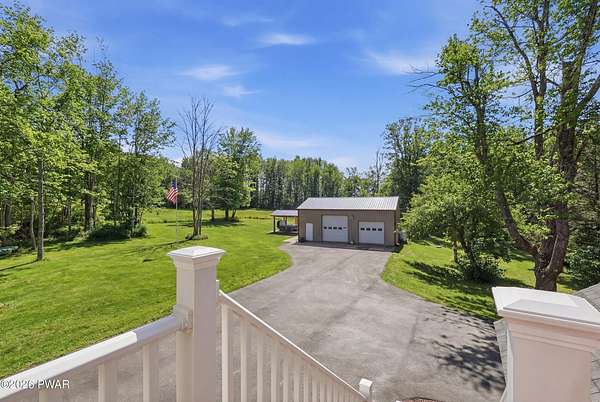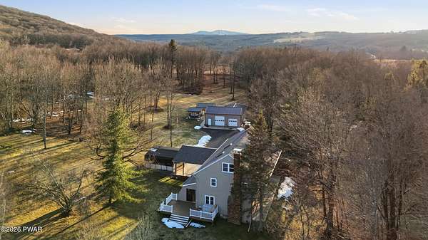 Set across 20 private acres with sweeping views of Elk Mountain, this extraordinary Northern Poconos estate offers a rare combination of space, privacy, recreation, and unforgettable entertaining areas. A long winding driveway welcomes you through open lawn, mature trees, and apple and pear trees with blueberry bushes scattered throughout the property, creating a beautiful natural landscape that feels both peaceful and productive. Perfectly located just 10 minutes to Elk Mountain Ski Resort, 15 minutes to Forest City, and about 40 minutes to Lake Wallenpaupack, the property also features 127 feet of frontage along the Rails & Trails system, allowing direct access for ATV riding, snowmobiling, biking, and year-round outdoor adventure right from your own land. The land itself attracts abundant wildlife and offers incredible opportunities for nature watching, outdoor recreation, and enjoying the natural surroundings right outside your door. The centerpiece of the estate is an impressive 4,000+ square foot, 5-bedroom home positioned to take full advantage of the mountain views and surrounding scenery. Inside, the home offers a spacious and welcoming layout designed for both everyday living and entertaining, featuring beautiful wood accents, an elevated dining area, a bright sunroom with incredible views, and a gourmet kitchen with large center island and custom cabinetry that serves as the heart of the home. Whether hosting gatherings or enjoying quiet mornings overlooking the property, the design blends comfort with function. The third floor has already been plumbed and wired for a future one-bedroom suite, offering excellent flexibility for guests, extended family, or additional rental space. Fiber-optic internet provides lightning-fast connectivity throughout the home, making remote work, streaming, and smart home living seamless. Beyond the home, the property transforms into a true lifestyle compound with incredible amenities rarely found together.
