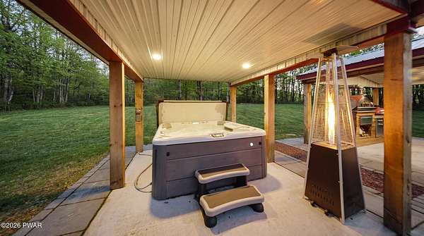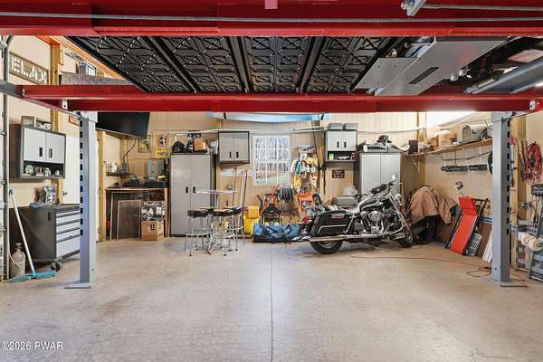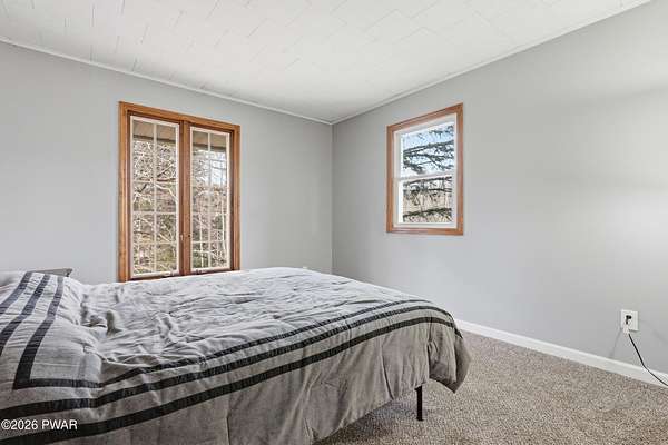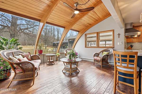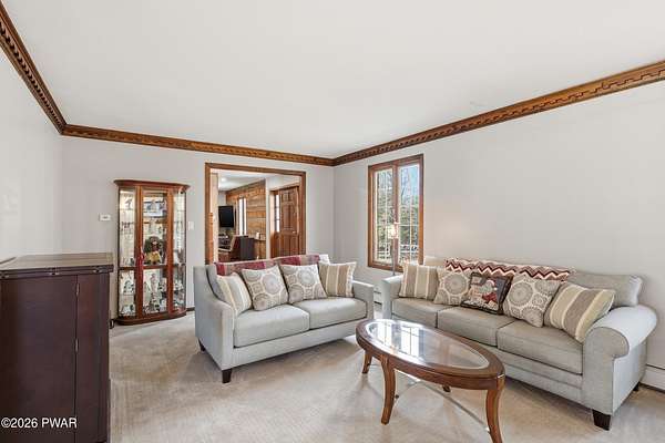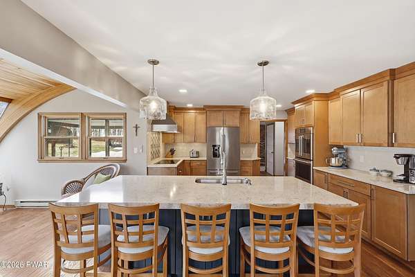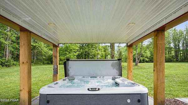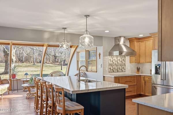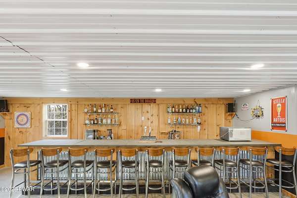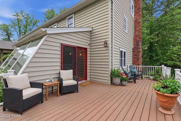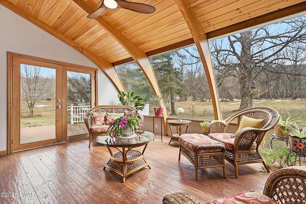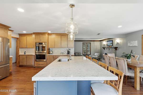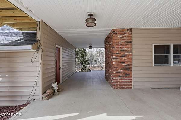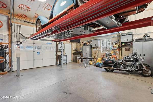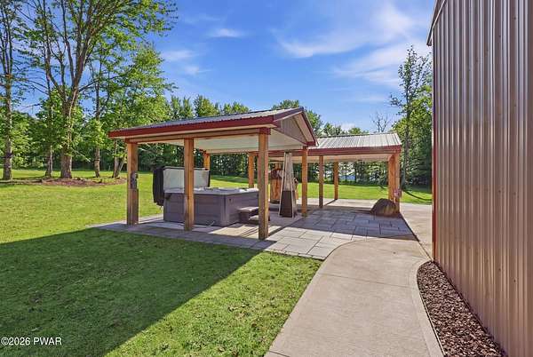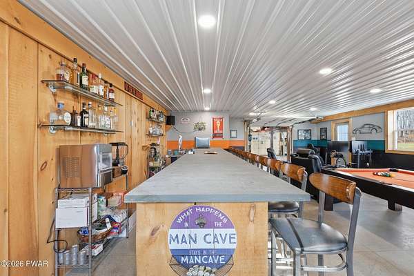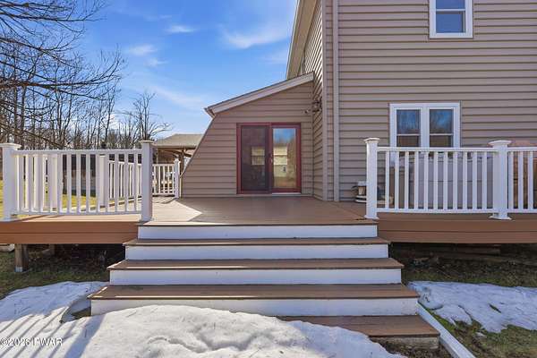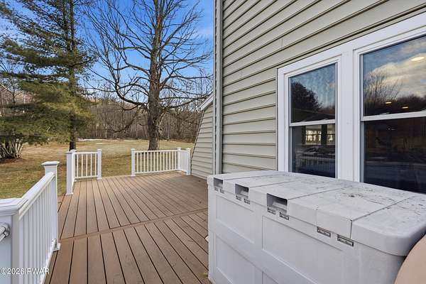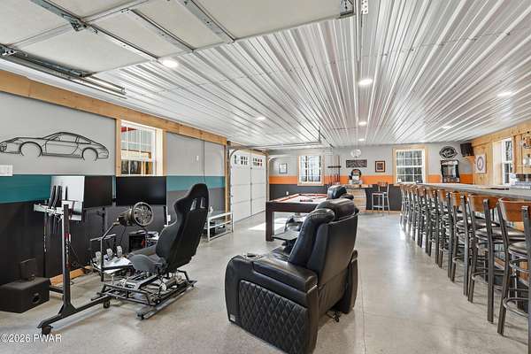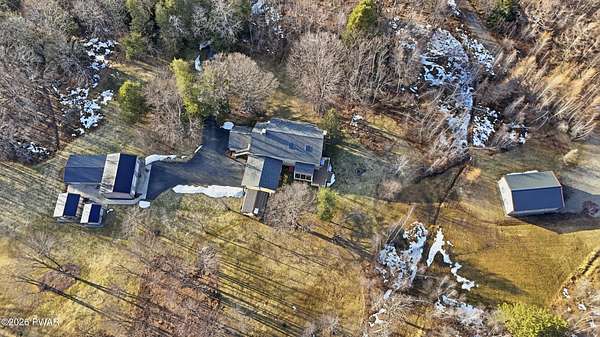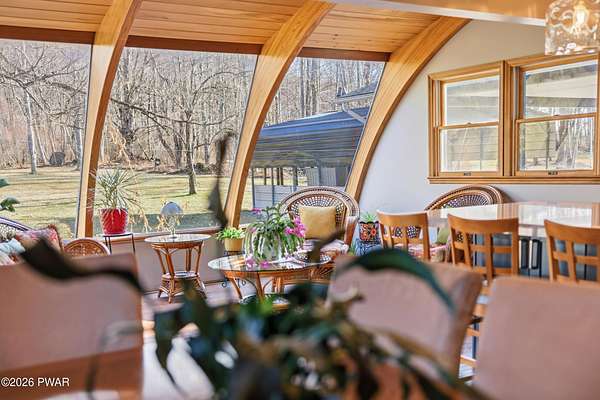 Set across 20 private acres with sweeping views of Elk Mountain, this extraordinary Northern Poconos estate offers a rare combination of space, privacy, recreation, and unforgettable entertaining areas. A long winding driveway welcomes you through open lawn, mature trees, and apple and pear trees with blueberry bushes scattered throughout the property, creating a beautiful natural landscape that feels both peaceful and productive. Perfectly located just 10 minutes to Elk Mountain Ski Resort, 15 minutes to Forest City, and about 40 minutes to Lake Wallenpaupack, the property also features 127 feet of frontage along the Rails & Trails system, allowing direct access for ATV riding, snowmobiling, biking, and year-round outdoor adventure right from your own land. The land itself attracts abundant wildlife and offers incredible opportunities for nature watching, outdoor recreation, and enjoying the natural surroundings right outside your door. The centerpiece of the estate is an impressive 4,000+ square foot, 5-bedroom home positioned to take full advantage of the mountain views and surrounding scenery. Inside, the home offers a spacious and welcoming layout designed for both everyday living and entertaining, featuring beautiful wood accents, an elevated dining area, a bright sunroom with incredible views, and a gourmet kitchen with large center island and custom cabinetry that serves as the heart of the home. Whether hosting gatherings or enjoying quiet mornings overlooking the property, the design blends comfort with function. The third floor has already been plumbed and wired for a future one-bedroom suite, offering excellent flexibility for guests, extended family, or additional rental space. Fiber-optic internet provides lightning-fast connectivity throughout the home, making remote work, streaming, and smart home living seamless. Beyond the home, the property transforms into a true lifestyle compound with incredible amenities rarely found together.