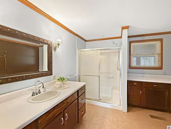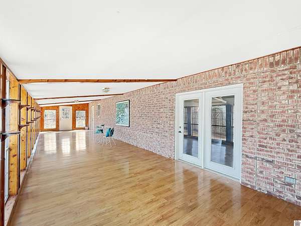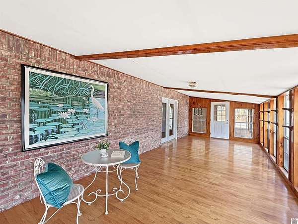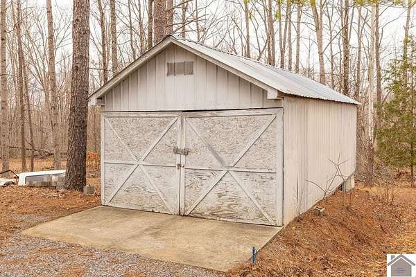 Spacious 3BR/2BA one-level brick ranch nestled in a secluded setting on 2.3 acres near Kentucky Lake. The home features tile flooring throughout, an open-concept main living area with living room, dining, and kitchen flowing together—perfect for entertaining. The kitchen offers a breakfast bar, island, abundant counter space, and tons of cabinets. Spacious primary suite includes a large ensuite bath and an oversized cedar-lined walk-in closet. Enjoy year-round relaxation in the extremely large sunroom overlooking the private backyard. Attached 2-car garage plus a massive shop behind the home, along with additional toy storage and shed—all with electric. Peaceful country living just minutes from the lake!