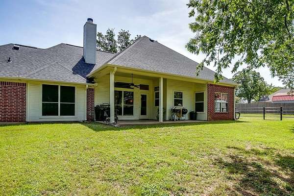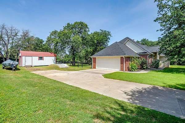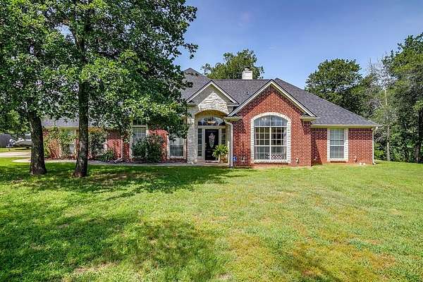 Beautifully crafted, custom home located on a quiet cul de sac in the family friendly Heritage Oaks subdivision. Nestled among mature oak trees and sitting on 1.73 acres, this beautiful home offers peace, privacy and plenty of charm. Featuring a classic brick and stone exterior, this three bedroom, two bath home includes two spacious living areas, a wood burning fireplace, tray ceilings and crown molding. The large kitchen overlooks the serene backyard with pipe fencing and features custom cabinets, corian counters and a nice size breakfast area. The spacious primary suite has beautiful laminate flooring and room for a desk or sitting area. The ensuite bath features dual sinks, a jetted tub, separate shower and double walk-in closets. Two nice size secondary bedrooms and guest bath complete this home. Outside you'll find mature oak trees, pipe fencing, landscaping, a large storage building with electricity, RV hook up, an in-ground tornado shelter and an extended driveway for extra parking. Unlike most new construction homes, this property offers more land, fencing, established trees and essential upgrades already in place - saving you time and money. Don't miss the opportunity to own this peaceful retreat with all the comforts of small town living. Close to schools and an easy commute to Azle - 15 minutes, Weatherford - 22 minutes and Fort Worth 40 minutes. If you feel like a little day trip to Winstar you're only a little over an hour away.