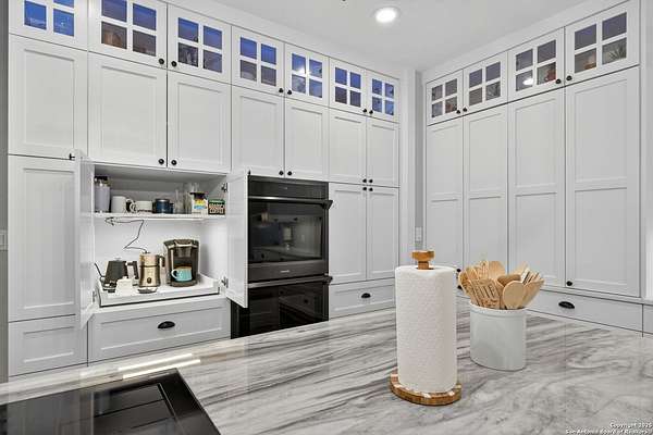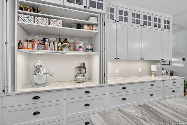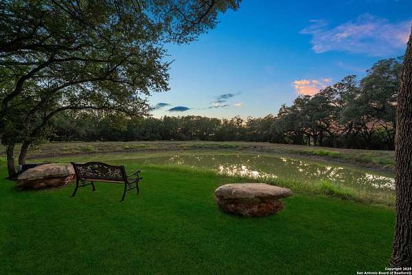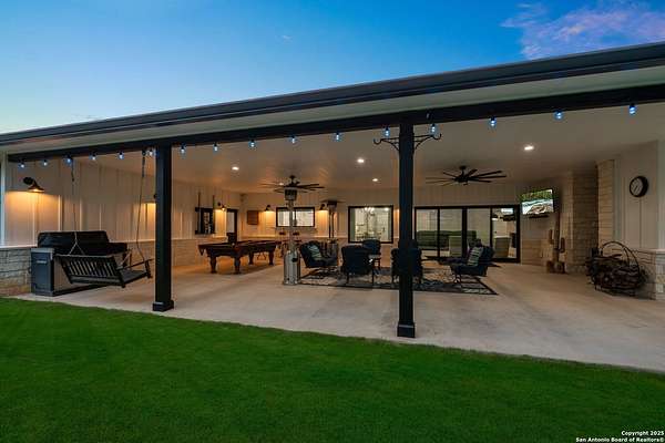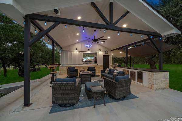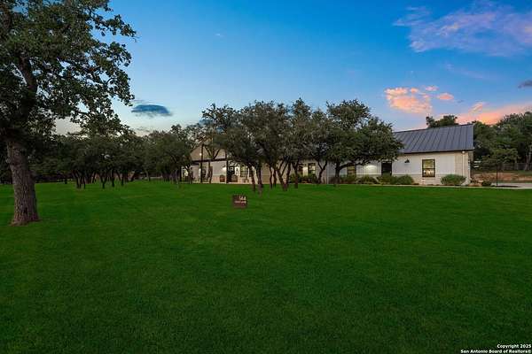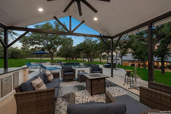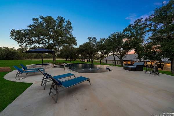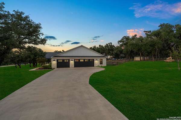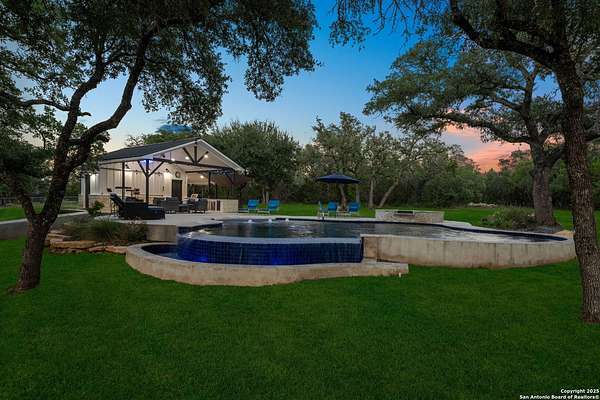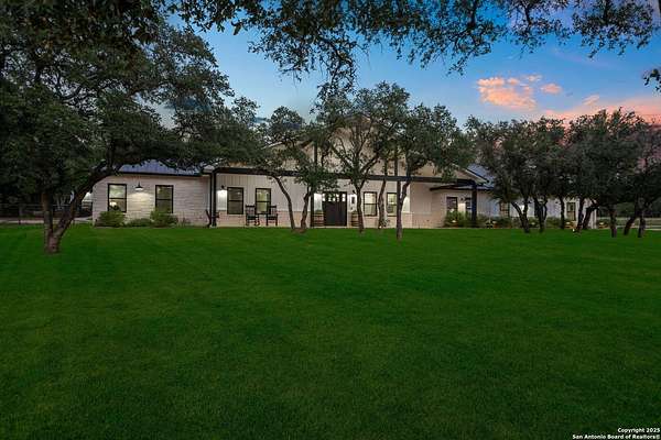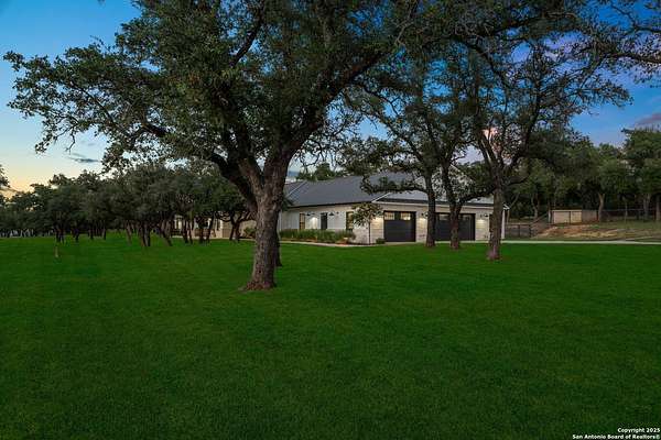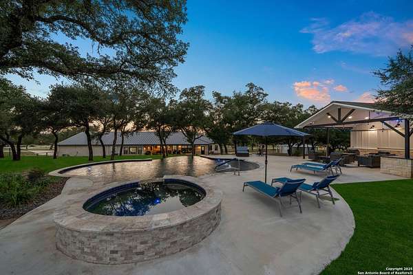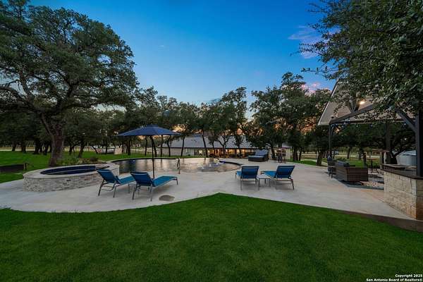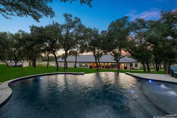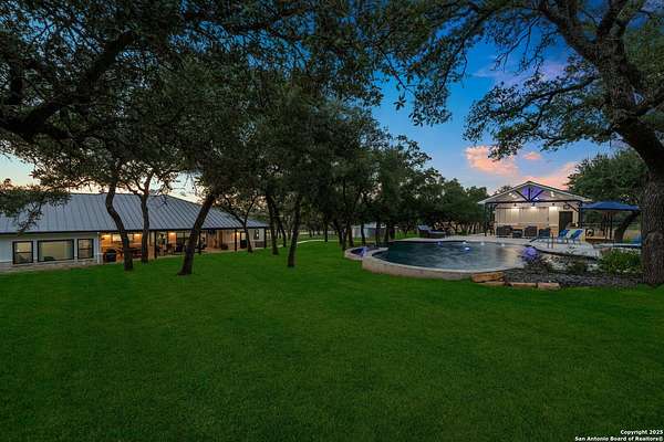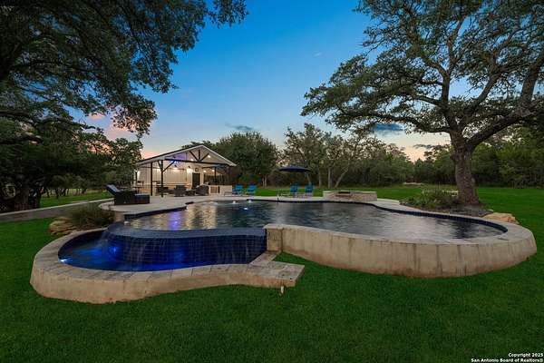 Welcome to 144 Lilly Lane, a masterfully executed custom estate in the exclusive gated community of Trinity Oaks Preserve. Completed in 2021, this residence embodies Hill Country elegance on over three private acres, secured by a 70-foot deed-protected greenbelt. The 3,526 sq ft single-story floor plan was brilliantly designed for modern living, featuring dual primary suites on opposite wings for ultimate privacy, five total bedrooms, a dedicated office with a fireplace, three full baths, and a convenient pool half-bath. Upon entry, the open-concept living area makes a grand statement with soaring vaulted ceilings, a dramatic floor-to-ceiling stone fireplace, and a wall of Pella Low-E windows that dissolve the boundary between indoors and the serene oak-studded landscape. The heart of this home is the chef's kitchen, a showcase of function and style. It features a magnificent ten-foot marble island, a premium induction dowdraft cooktop, and custom cabinetry locally milled to perfection. Behind this polished facade lies the home's secret weapon for entertaining: a truly hidden butler's pantry. This incredible space houses a wet bar, wine fridge, beverage cooler, deep freeze, and a stand-alone ice maker, allowing for effortless hosting while maintaining pristine main kitchen aesthetics. Additional custom details like a concealed coffee bar and a baker's hutch elevate the experience. The main primary suite forms a secluded owner's wing, a true sanctuary of restorative luxury. It features a tray ceiling and a programmable electric fireplace, while oversized windows offer tranquil views. Its spa-inspired bath is a work of art, with a freestanding double slipper tub positioned beneath a chandelier and a third fireplace. The oversized, LED-lit walk-in shower, dual vanities with a dedicated makeup station, a heated towel warmer, and two large custom closets complete this opulent retreat. This home is an engineering marvel, built to uncompromising standards. The entire structure is encased in a full spray foam envelope (R30+), ensuring remarkable energy savings. Peace of mind is guaranteed by a whole-house generator capable of running the entire property for extended durations. The infrastructure includes dual HVAC units (one with dual zones), two on-demand tankless propane water heaters, and a 30,000-gallon rainwater collection system. A proactive, custom-engineered drainage system with French drains and sump pumps ensures the grounds remain impeccable. The outdoor spaces are a private resort curated for an idyllic Hill Country lifestyle. A majestic oak tree forms a natural, welcoming archway on the path to the stunning custom in-ground pool, which features a vanishing infinity edge and a heated spa. Entertain on a grand scale across multiple covered patios, including a nearly 50-foot rear patio with a wood-burning stove and a 20x20 pool pavilion with a full outdoor kitchen. The property is secured by high-end, welded drill stem pipe ranch fencing, offering open views for spectacular sunsets and brilliant, star-filled night skies. Enjoy serene country living just minutes from Baylor Scott & White hospital, the future Flat Rock Creek retail center, Marble Falls, and Lake LBJ. With Austin's Bee Cave Galleria only 35 minutes away, this property is not just a home, but a legacy Hill Country retreat. With too many features to list, ask your Realtor for our property inclusions addendum.