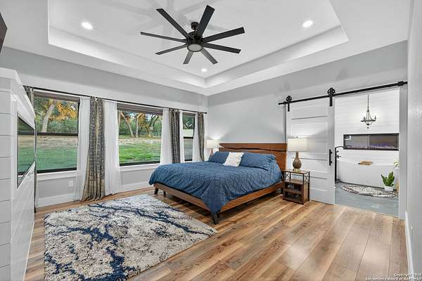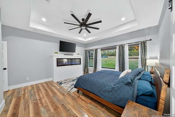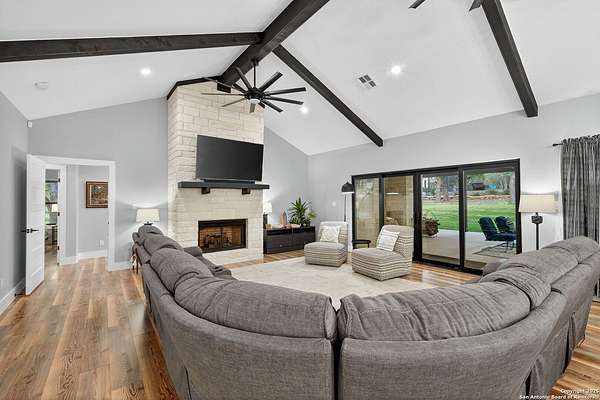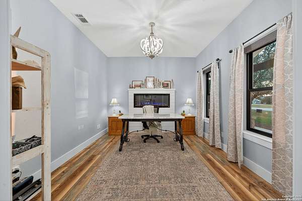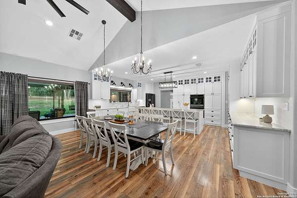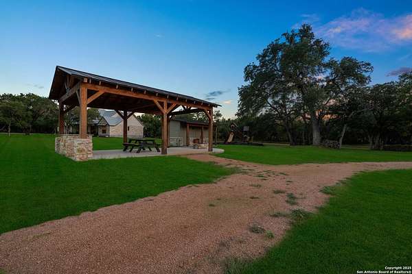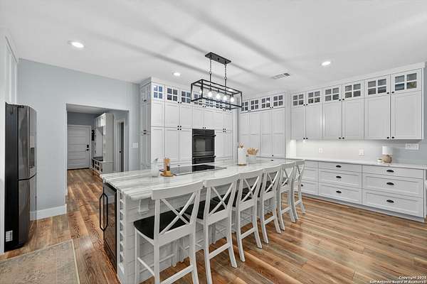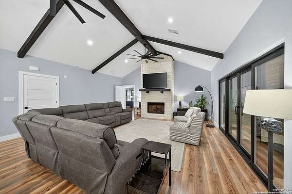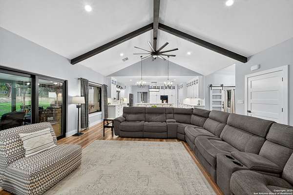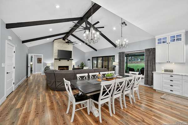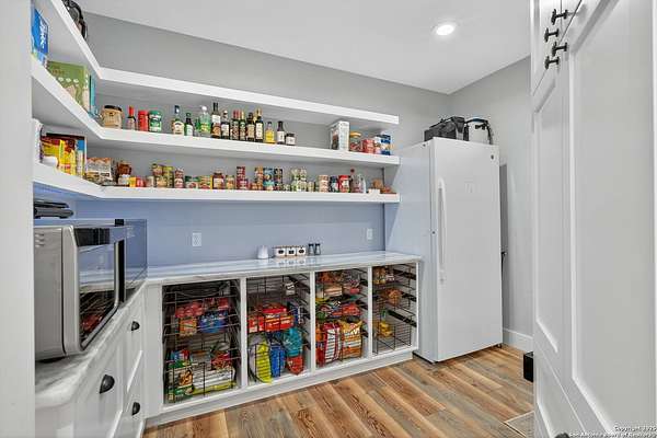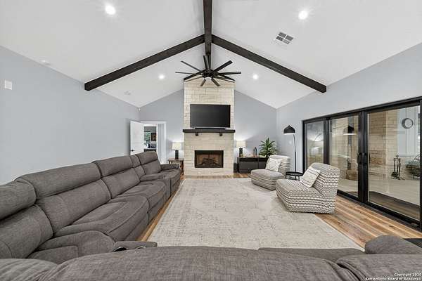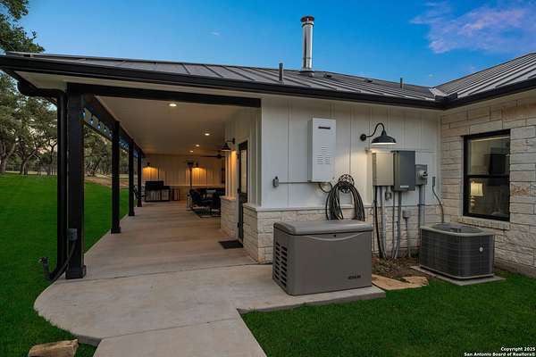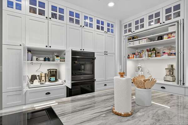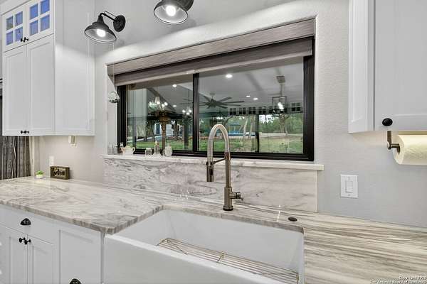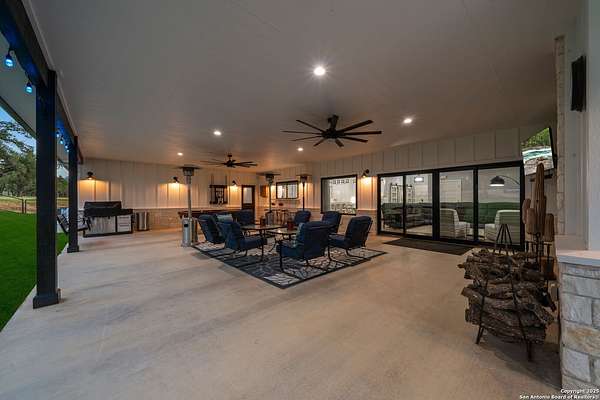 Welcome to 144 Lilly Lane, a masterfully executed custom estate in the exclusive gated community of Trinity Oaks Preserve. Completed in 2021, this residence embodies Hill Country elegance on over three private acres, secured by a 70-foot deed-protected greenbelt. The 3,526 sq ft single-story floor plan was brilliantly designed for modern living, featuring dual primary suites on opposite wings for ultimate privacy, five total bedrooms, a dedicated office with a fireplace, three full baths, and a convenient pool half-bath. Upon entry, the open-concept living area makes a grand statement with soaring vaulted ceilings, a dramatic floor-to-ceiling stone fireplace, and a wall of Pella Low-E windows that dissolve the boundary between indoors and the serene oak-studded landscape. The heart of this home is the chef's kitchen, a showcase of function and style. It features a magnificent ten-foot marble island, a premium induction dowdraft cooktop, and custom cabinetry locally milled to perfection. Behind this polished facade lies the home's secret weapon for entertaining: a truly hidden butler's pantry. This incredible space houses a wet bar, wine fridge, beverage cooler, deep freeze, and a stand-alone ice maker, allowing for effortless hosting while maintaining pristine main kitchen aesthetics. Additional custom details like a concealed coffee bar and a baker's hutch elevate the experience. The main primary suite forms a secluded owner's wing, a true sanctuary of restorative luxury. It features a tray ceiling and a programmable electric fireplace, while oversized windows offer tranquil views. Its spa-inspired bath is a work of art, with a freestanding double slipper tub positioned beneath a chandelier and a third fireplace. The oversized, LED-lit walk-in shower, dual vanities with a dedicated makeup station, a heated towel warmer, and two large custom closets complete this opulent retreat. This home is an engineering marvel, built to uncompromising standards. The entire structure is encased in a full spray foam envelope (R30+), ensuring remarkable energy savings. Peace of mind is guaranteed by a whole-house generator capable of running the entire property for extended durations. The infrastructure includes dual HVAC units (one with dual zones), two on-demand tankless propane water heaters, and a 30,000-gallon rainwater collection system. A proactive, custom-engineered drainage system with French drains and sump pumps ensures the grounds remain impeccable. The outdoor spaces are a private resort curated for an idyllic Hill Country lifestyle. A majestic oak tree forms a natural, welcoming archway on the path to the stunning custom in-ground pool, which features a vanishing infinity edge and a heated spa. Entertain on a grand scale across multiple covered patios, including a nearly 50-foot rear patio with a wood-burning stove and a 20x20 pool pavilion with a full outdoor kitchen. The property is secured by high-end, welded drill stem pipe ranch fencing, offering open views for spectacular sunsets and brilliant, star-filled night skies. Enjoy serene country living just minutes from Baylor Scott & White hospital, the future Flat Rock Creek retail center, Marble Falls, and Lake LBJ. With Austin's Bee Cave Galleria only 35 minutes away, this property is not just a home, but a legacy Hill Country retreat. With too many features to list, ask your Realtor for our property inclusions addendum.