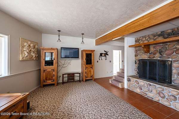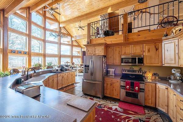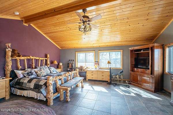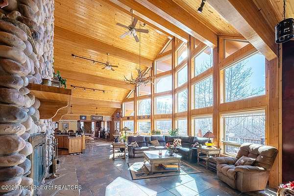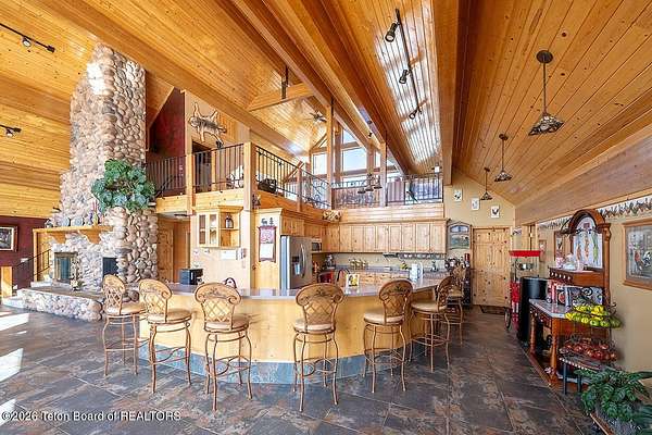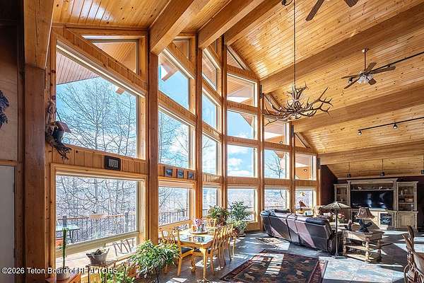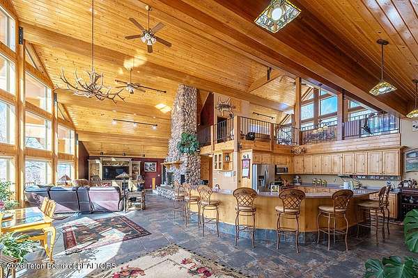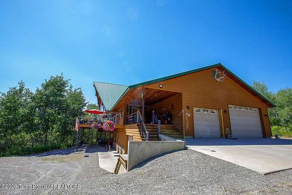Soak in breathtaking views and abundant natural light at this stunning Etna, WY retreat. Set on 7.68 picturesque acres, this home features soaring ceilings and expansive windows that create an inviting, sunlit ambiance. The thoughtfully designed layout includes a fully finished walk-out basement, complete with its own kitchen, laundry, and private entrance--ideal for a guest suite, rental opportunity, or a comfortable mother-in-law setup. Upstairs, the open-concept living space seamlessly blends the living room, kitchen, and a cozy loft, making it perfect for gatherings and entertaining. High-end finishes bring warmth and charm to every corner, from the custom Alder cabinets and slate flooring to the striking river rock fireplace. This home is more than a place to live--it's a space to tru truly savor life, whether you're relaxing indoors or taking in the scenic surroundings and the privacy from the abundant trees.