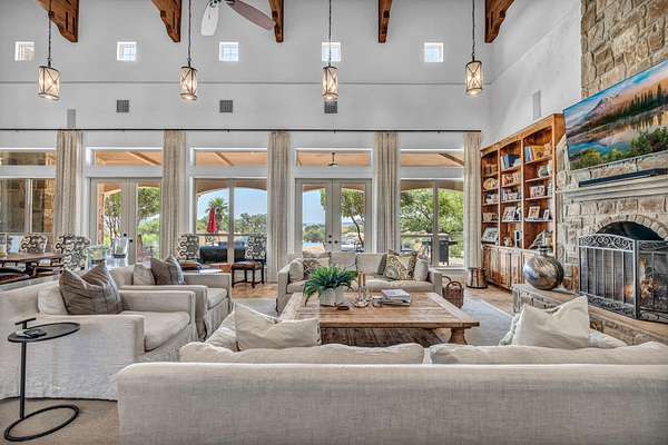 An exceptional opportunity in The Peninsula at Mystic Shores, this 6 acre waterfront property offers rare privacy, sweeping lake views, and direct access to Canyon Lake. W/ 1200+linear feet of combined main shoreline and cove frontage (buyer to verify), plus a private on-site boat launch/ramp, this residence is positioned for an elevated Hill Country lake lifestyle. The home features 24ft beamed ceilings, expansive windows, and an open layout filled w/ natural light. The kitchen includes custom cabinetry, double ovens & seamless flow to both casual & formal dining areas. Outdoor living includes a full kitchen, fireplace, and generous covered spaces designed for year-round enjoyment. The primary suite includes a stone-clad fireplace, spa inspired bath & panoramic water vistas. 2 main level offices provide functional flexibility, while the upstairs media & game room w/ wet bar offer ideal spaces for recreation & hosting. Outside, an infinity-edge pool w/ rock waterfalls overlooks a gently sloping lawn leading toward the shoreline. Additional features include an attached 4 car garage w/a covered boat bay & workshop, a private irrigation well & high-speed internet. Ownership in Mystic Shores includes access to a 26 acre lakefront park, resort-style pool, tennis & pickleball courts, sand volleyball, trails & more. An adjacent 4 acre waterfront tract is also available offering increased shoreline, enhanced privacy & future possibilities for guest accommodations or additional amenities. Call agent for details