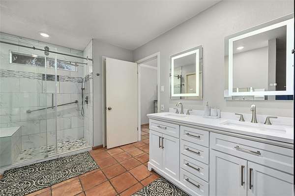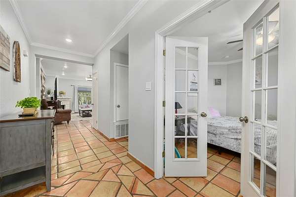 - Breakfast Bar, Built-In Features, Ceiling Fan(s), Ceiling-High, Chandelier, Coffered Ceiling(s), Crown Molding, Double Vanity, Eat-In Kitchen, Entrance Foyer, Granite Counters, High Speed Internet, Kitchen Island, Low Flow Plumbing Fixtures, Multiple Dining Areas, Multiple Living Areas, Natural Woodwork, No Interior Steps, Open Floorplan, Pantry, Primary Bedroom On Main, Recessed Lighting, Smart Thermostat, Soaking Tub, Two Primary Closets, Walk-In Closet(s)