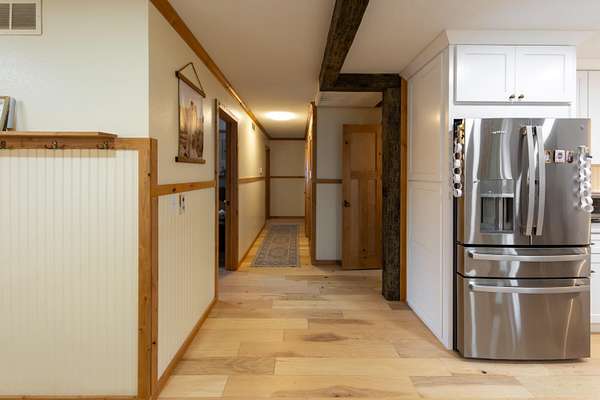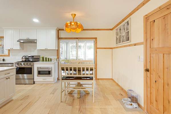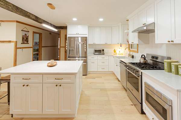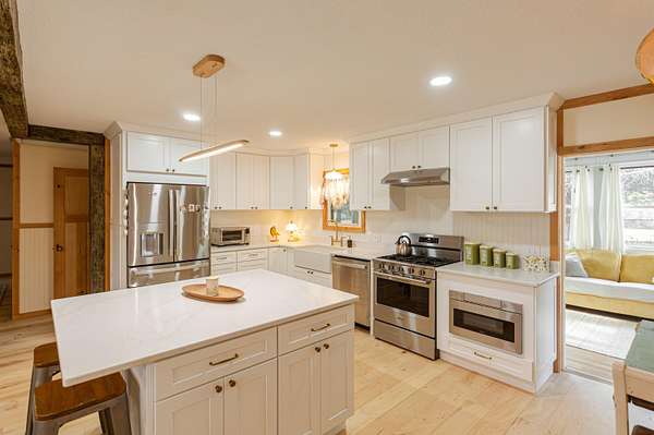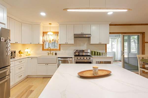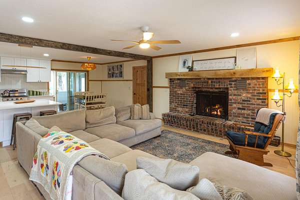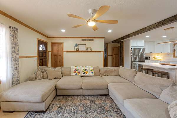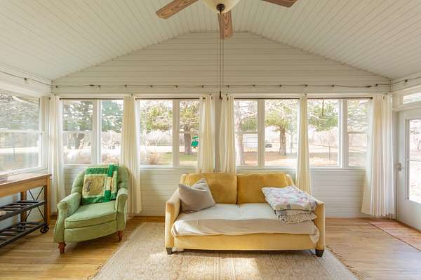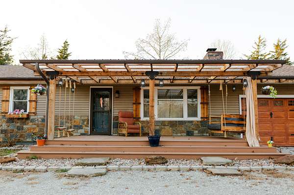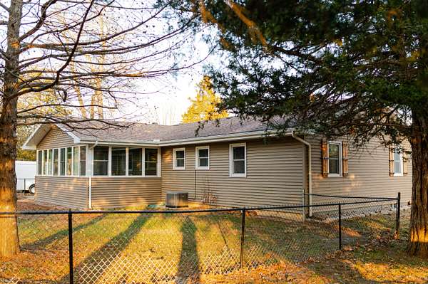 Tucked away on a quiet cul-de-sac just outside the city limits, this beautifully remodeled 3-bedroom, 2-bath residence sits on 1.9 acres in a highly desirable neighborhood and features a convenient circle drive for easy access and parking. Thoughtfully transformed from top to bottom. Inside, beautiful hardwood floors flow throughout much of the home, complimented by quartz countertops and a designer kitchen ideal for both daily living and entertaining. The kitchen showcases a farmhouse-style sink, a statement island with seating, and comes fully equipped with a refrigerator, gas range, exhaust hood, dishwasher, and built-in microwave, making it truly move-in ready. The inviting living area is anchored by a gas-insert brick fireplace, while the expansive sunroom, lined with windows and accented by a ceiling fan, offers a tranquil retreat and steps directly out to the patio and the chain-link fenced area, creating an effortless indoor-outdoor connection ideal for entertaining, kids, or pets. The primary suite offers a private retreat with a spa-inspired walk-in shower featuring a luxurious rain showerhead. A full unfinished basement provides exceptional storage or the opportunity for future living space. Outdoors, enjoy a spacious yard, the fenced area perfect for children or animals, a newly built pergola-style covered front deck finished with low-maintenance composite decking and bonfire area. Designed for relaxation, the deck features a full porch swing and two additional swings, creating the perfect setting for morning coffee or evening unwinding. Additional features include a 1-car attached garage and a detached 12x16 garage/outbuilding with concrete flooring, walk-in door, and garage door--ideal for a workshop or extra parking. This exceptional property offers refined upgrades, privacy, and convenient access to town.