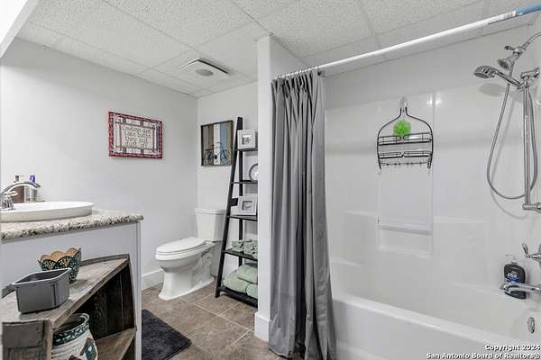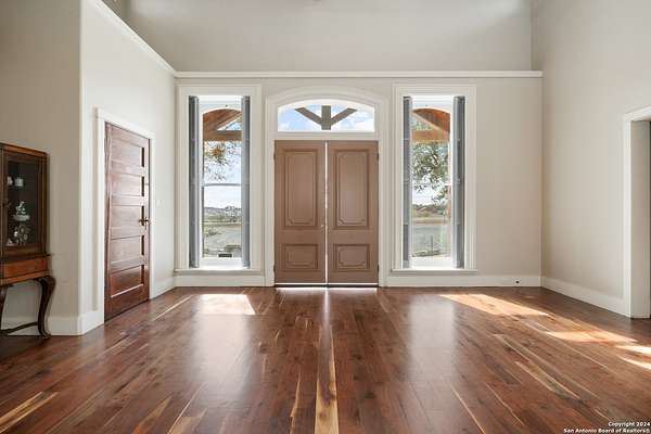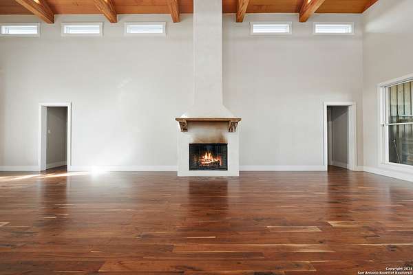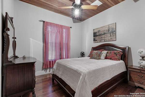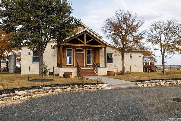 Nestled on expansive land, this home draws inspiration from an old Fredericksburg barn, blending rustic charm with modern craftsmanship. This custom 4,200 sq ft home has a split-bedroom layout on the main level, offering a private master suite with a fireplace, walk-in shower, and hydrotherapy tub, while three additional bedrooms and two baths sit on the opposite wing. The heart of the home boasts soaring vaulted ceilings framed with East Texas yellow pine timber, reclaimed bleacher seat planks, and 5" black walnut floors showcasing stunning grain variations. The fully finished basement features a bedroom, family room, full bath, and secure room, while foam insulation ensures energy efficiency. Rainwater harvesting systems, a 90' well, and solar panels complement the eco-friendly design. A spacious 2,400 sq ft, 17' ceiling, metal building with sliding doors and an additional 1,100 sq. ft. dwelling expand the property's versatility. Located just outside of New Braunfels city limits on over 10 acres, this one-of-a-kind Texas haven, offering unparalleled character, sustainability, and functionality.