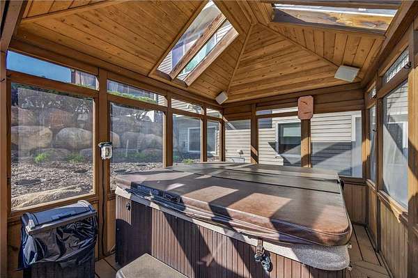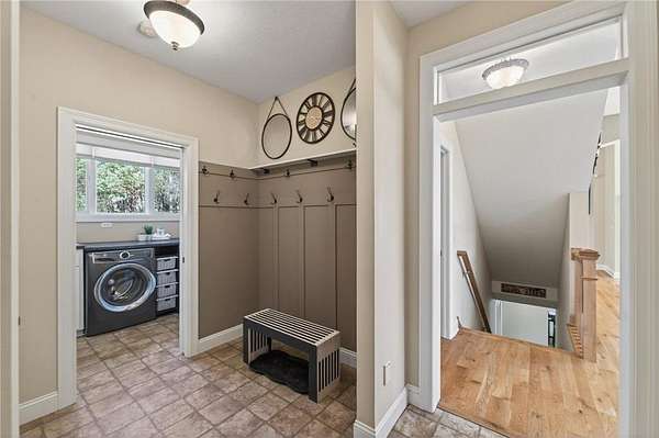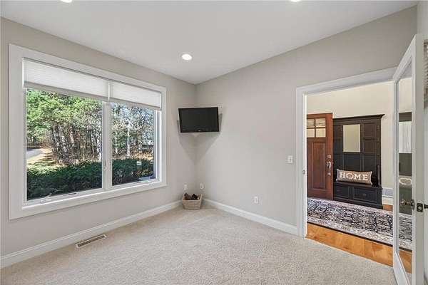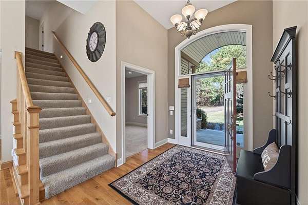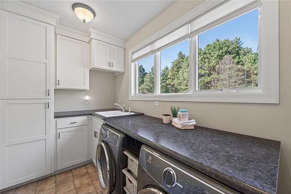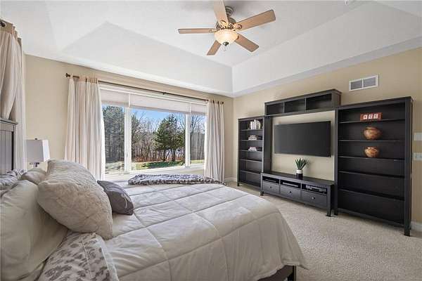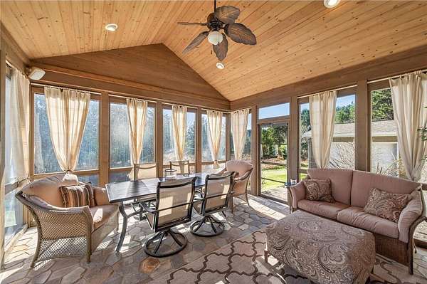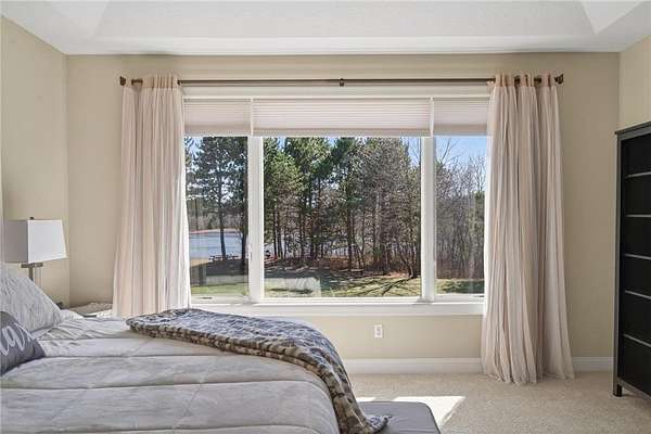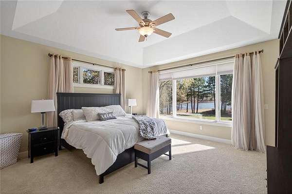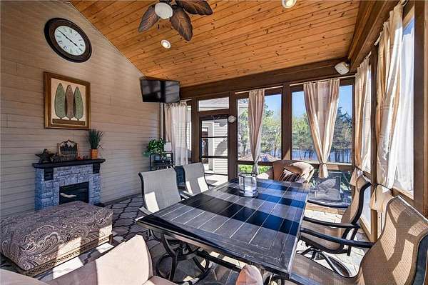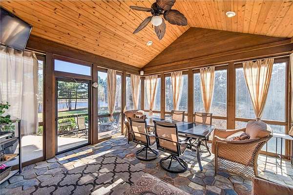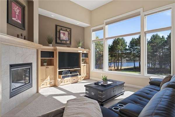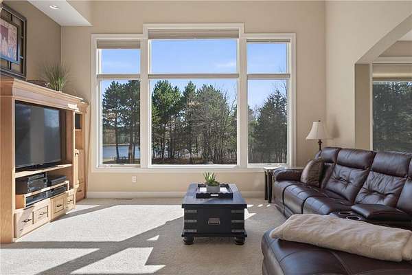 The main level showcases a luxurious primary bedroom with a walk-in closet and sweeping pond views, creating a private sanctuary. The open-concept design flows seamlessly into the kitchen with a double oven and generous gathering space, while a convenient main-level laundry room adds practical functionality. Oversized windows throughout flood the space with natural light, and a three-season porch provides a peaceful place to enjoy the water views and surrounding nature year-round.