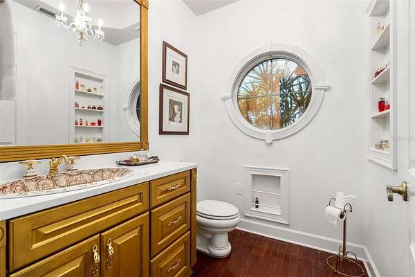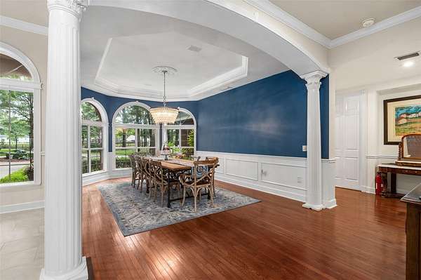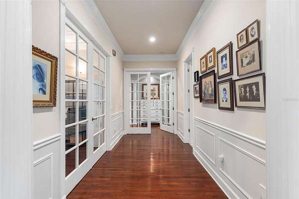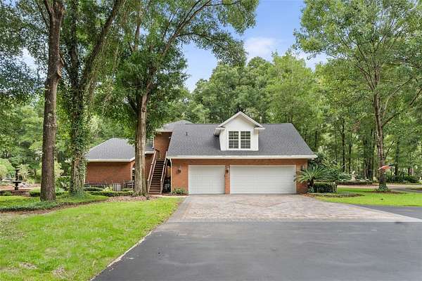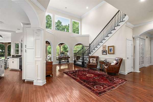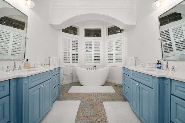 The main residence offers a gated entrance within a gated entrance, offering privacy and protection. As you wind down the picturesque drive and around the fountain, you'll know you've arrived. The two story brick residence stands tall, yet feels inviting. Enter inside and you'll be captivated by the two story formal living room. To the right you'll find the office, a guest room / nursery, and a double door entry leading to the palatial primary suite with two walk in closets, a beautifully remodeled primary bathroom with separate vanities, a frameless glass shower, and a standalone tub surrounded by windows.