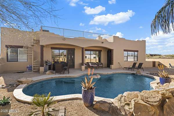 HORSE ENTHUSIAST'S RANCH - A DREAM WINTER RETREAT! Rare chance to own one of few ranches in Rio Verde Foothills w/easy paved access,abundant well water,amazing horse facilities,and a resort style home and pool!Thoughtfully designed w/the horse lover in mind!Custom 8 stall barn,designed for optimum airflow,2 wash racks,tack/ storage rms,misters,paver alleyway,hot water,LED,30/50 amp RV svc.,2 paddocks, covered hay storage,112'x224' arena w/sprinklers and 5-rail fencing,4-rail List of Upgrades & Fine Features under the doc. tab of listing. Here they are as well: 14410 & 14422 E. Monument Dr., Scottsdale, AZ 85262 APN #219-39-188 L & M - (2.3 ACRES) HOME FEATURES * Remodeled less than 2 years ago * 2900+/- s.f. * 3 bedrooms, 3 bathrooms, split floorplan * Spacious family room/great room with cozy fireplace and niches for your western art * Huge Office/den, bonus room with window bay seating off kitchen * Superior lighting and ceiling fans throughout * 8' Alderwood front doors * French doors throughout * 3 private courtyards * Covered patios front and back * Energy efficient- 2" x 6" exterior walls, dual pane windows * Window shutters throughout * 2-car garage- Extended length, 8' tall doors (Fits tall vehicles) * Well appointed kitchen: * Quartz counter tops * White, subway, backsplash * Breakfast bar and separate island * 2 refrigerators * Electric cook top and wall oven * Built-in microwave * Alderwood cabinets and pantry * Large master suite & bath: * Freshly painted * Walk-in shower * Jacuzzi tub * 2 sinks * Spacious walk-in closet * Plank tile floors * Rear patio access * 2nd bedroom: Accommodates kingsize bed, large walk-in closet * 3rd bedroom: Spacious with on-suite bathroom. Great for guests or in-laws * Hall bathroom with tub/shower * Security cameras throughout, 50 amp service for RV's * Nnewer exterior paint * Energy efficient- 2 heat pumps for heating & cooling. 1 replaced 3 to 4 years ago FRONT COURTYARD * Gated front courtyard- Paved stone walkway & lounge area, kiva fireplace, built-in seating * Custom security screen doors throughout * Covered front patios BACKYARD * Swimming pool- Pebble-tec finish, granite, boulder, waterfall feature, newer pool filter * Privacy block wall * Spiral staircase leading to view deck capturing panoramic mountain views * Low maintenance, professional landscaping. Paver, outdoor, seating/dining, area * Covered rear patio HORSE FACILITIES / PROPERTY HIGHLIGHTS * BARN- Custom built for optimal functionality and air flow, Overall dimensions- 36' x 72' Paver alley/breezeway (8) 12' x 12' stalls, 3 in 1 feeders, wire mesh stall fronts (2) 12' x 12', matted, wash racks 12' x 12' tack room on slab 12' x 12' storage room on slab Misters, hot water, power, led lights, 30 amp service for RV hook-ups * 12' x 14' covered hay storage on slab. Holds up to 100 bails * (2) 40' x 50' turnouts/paddocks * Arena: 112' x 224' with 5 rail pipe fencing. Graded for optimal drainage. * Room for holding pen, cattle run, and more * Perimeter, 4 rail pipe, fencing * Solar powered, double RV gate, entrance * Gated, privacy, RV parking area with 30 & 50 amp service ADDITIONAL HIGHLIGHTS * 2.3 ACRES- (2) parcels, APN #219-39-188 L & M. Each parcel comes with water from a shared well * Well located on property with abundant water supply. Pressure tank, booster pump, replaced 1 year ago * Paved access all the way to property * Spectacular mountain views * Low property taxes. No HOA! * Easy access to the 3.5 million acre Tonto National Forest and the Scottsdale McDowell Sonoran Preserve, offering endless trail riding, hiking, mountain bike riding, and off-road adventures Located among world-class horse training ranches and equine properties * Minutes from Westworld, golf, shopping, restaurants, and much more