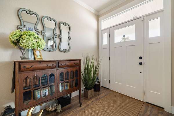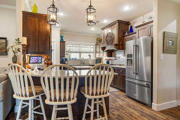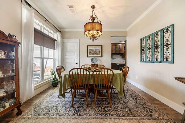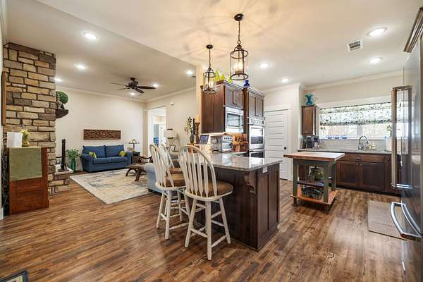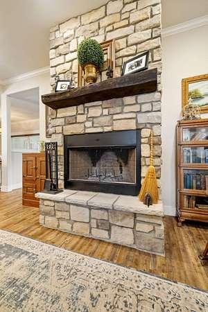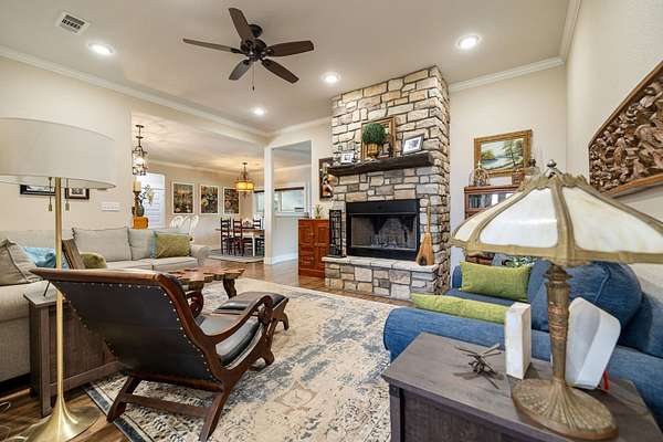 Sophisticated Interiors: Step through a stone-walk entry into a home featuring 10-foot ceilings in the grand foyer and 9-foot ceilings throughout. Elegant crown molding accents the living, kitchen, and dining areas, while a beautiful rock fireplace with a propane starter serves as the home's cozy focal point.