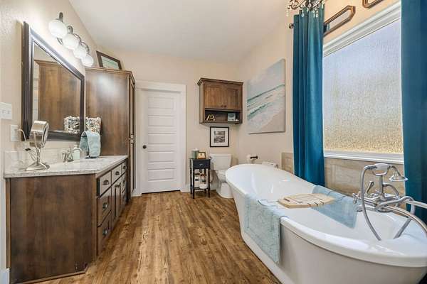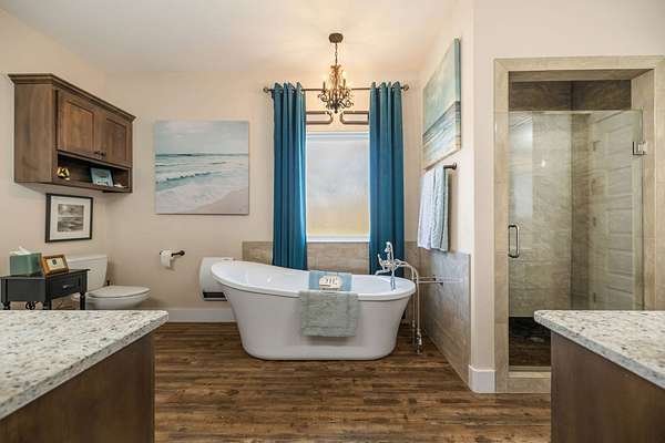 The Primary Suite: A massive sanctuary featuring a spa-like bathroom with a luxurious soaking tub, a custom tiled shower, and a generous walk-in closet.