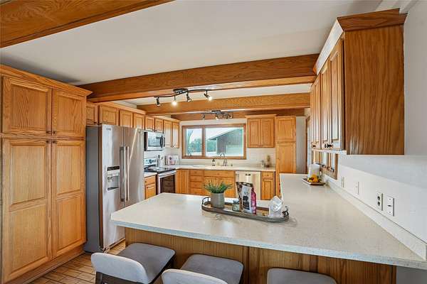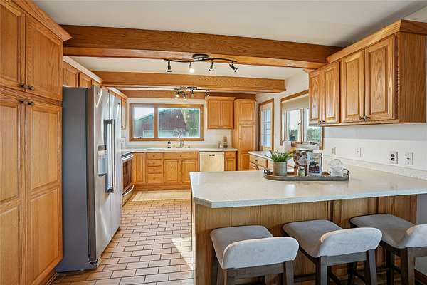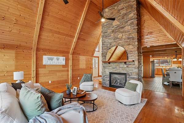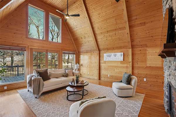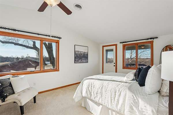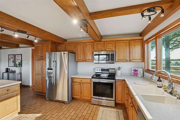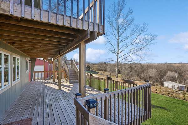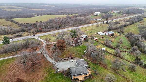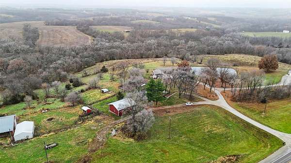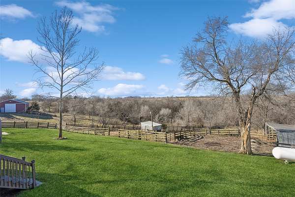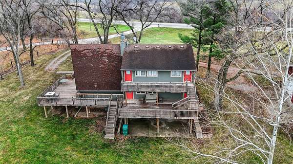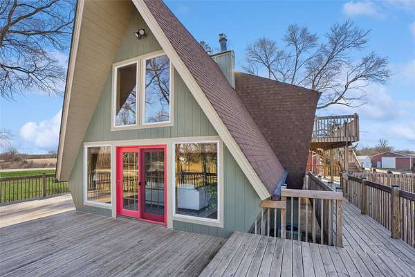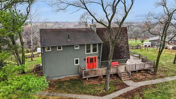 Your own private retreat, on pavement and only minutes to Indianola. Just shy of 30 Acres to enjoy featuring pasture & timber and ready for animals or just wide-open space to explore! This 3 Bedroom modified A-frame, built in 1977, is sure to impress with fresh interior paint, welcoming two story entry & soaring living room with floor to ceiling stone gas fireplace and windows showing amazing views! Step out onto one of the many deck options & be greeted with beautiful sunrises or sunsets! Main level bedroom could also be used as home office (IMU Fiber internet is accessible here = fast internet!) Open kitchen & dining space make this home perfect to entertain! All kitchen appliances + washer/dryer included for you! 2 Bedrooms upstairs plus 1.5 baths. Lots of storage throughout too! Finished walkout lower level features additional living room w/ fireplace, kitchenette & storage room with access to backyard. Oversized detached building (32x40) is close by & has plenty of garage parking space + walk up loft. Many additional buildings on the property make this acreage truly ready & waiting for you! Home warranty added for peace of mind. Come take a look!