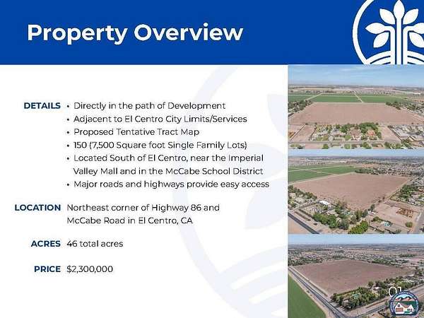 Est $16,833/mo46 Acre Single Family Residential development opportunity previously submitted to the Imperial County Planning and Development services department for annexation. Currently zoned A-1 with proposed zone of R-1 with a tentative tract map for 150 homes with 7,500 square foot lots. The prior development was stalled due to market conditions. The property is primed and ready for the next developer to pick up where they left off and go vertical.