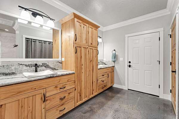 - Crown Molding, High Ceilings, Kitchen Island, Separate Dining Room, Split Bedroom Plan, Sun Room, Two Primary Suites, Washer/Dryer Hookup