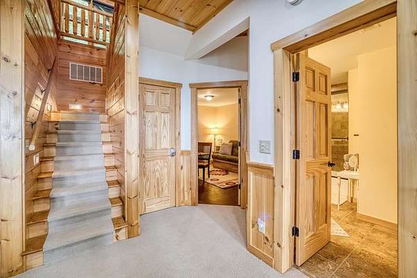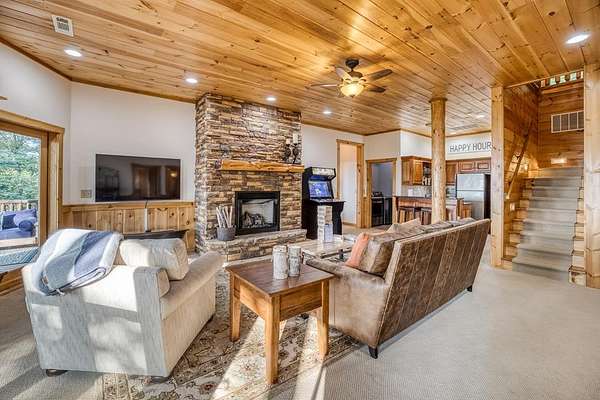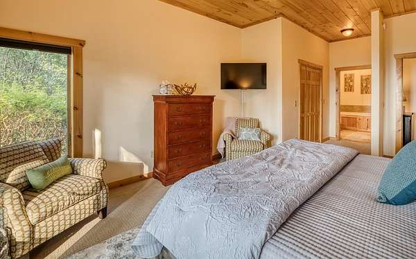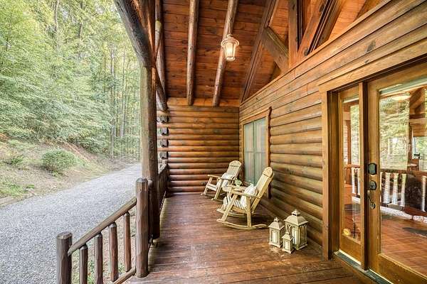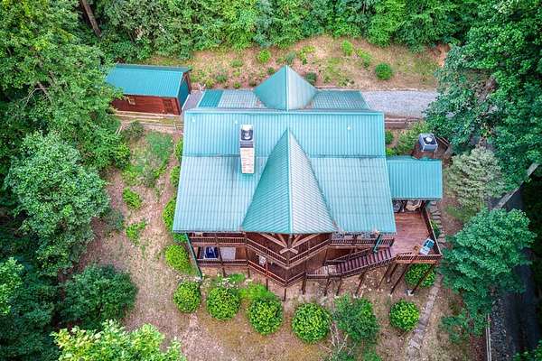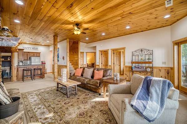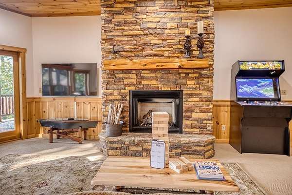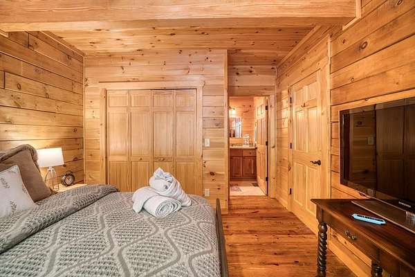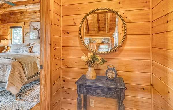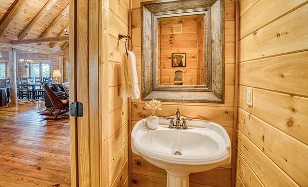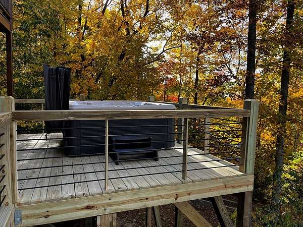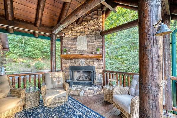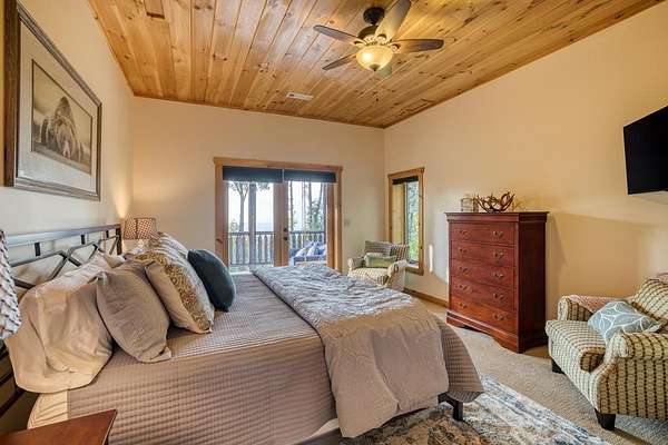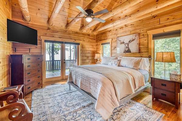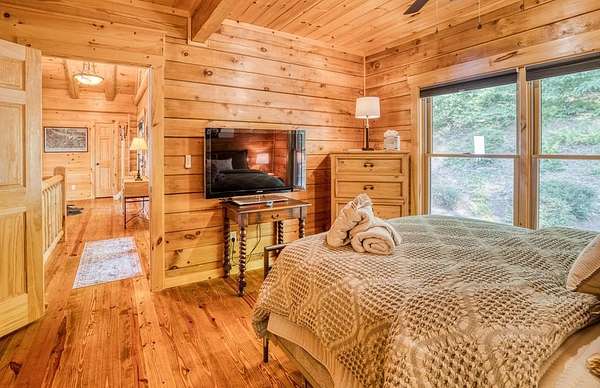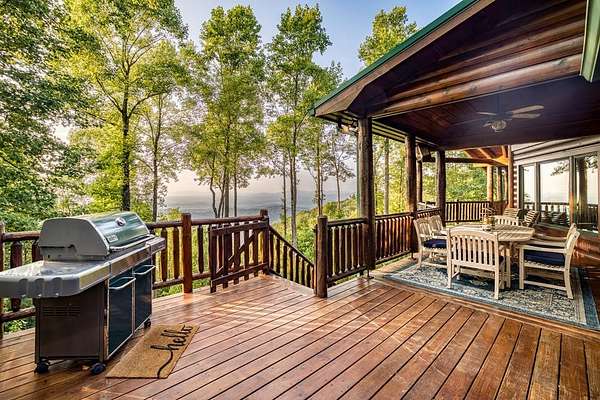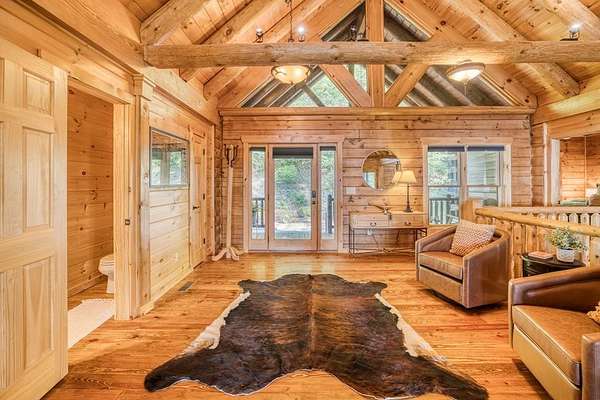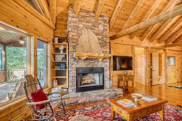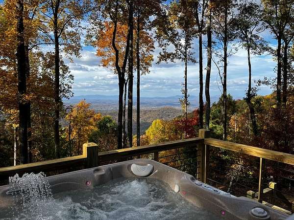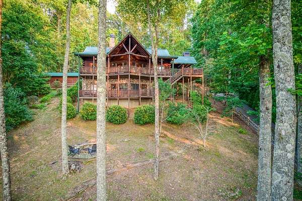 A UNICORN FIND! Luxury home w/ AMAZING VIEW & Great established rental history $$$, backs up to over 1000 acres National Forest with YOUR OWN Trail entrance! Located in GATED community with all paved access, just 5 miles to downtown Blue Ridge in popular ASKA Adventure Area, close to Toccoa River, Lake Blue Ridge where boating, tubing, fishing, hiking Kayaking are at your doorstep. This impressive TRUE LOG home has large open living spaces on each level w/ 4 bedroom suites, plus 1/2 bath off the living area for convenient/ private sleeping arrangements. PLUS additional 4-bed bunkroom (a favorite spot for kids) and plenty of onsite amenities including 3 Fireplaces, HOT TUB (new in 2023), Stone Firepit, full game/TV area with WET BAR and laundry on BOTH levels! Birdseye view of mountains from 3000ft elevation, yet so convenient to everything! Furniture & furnishings negotiable.