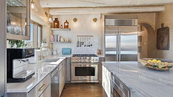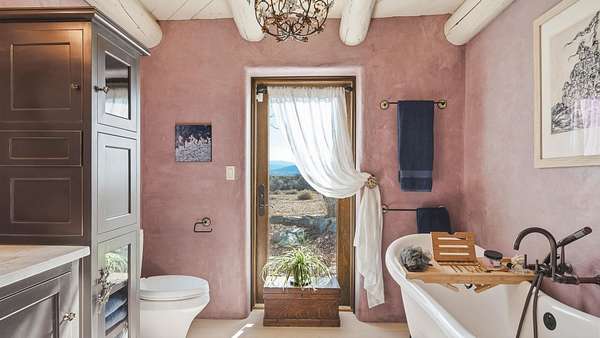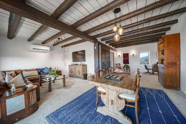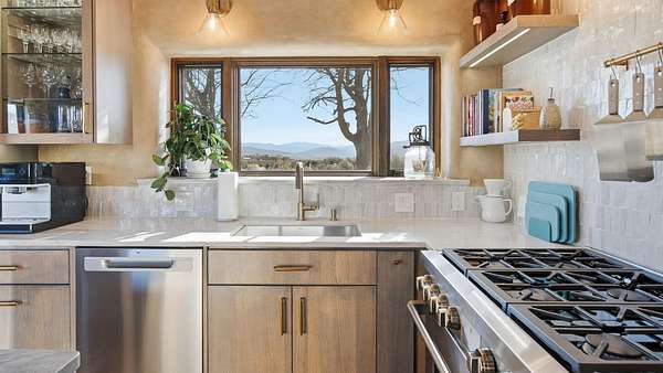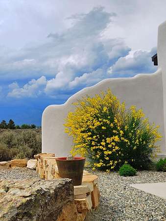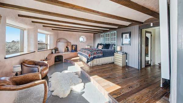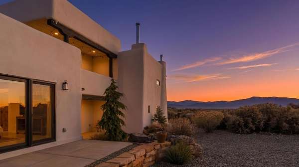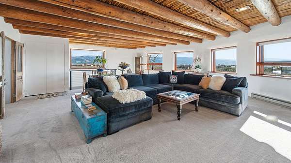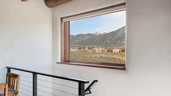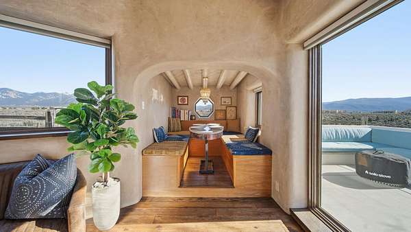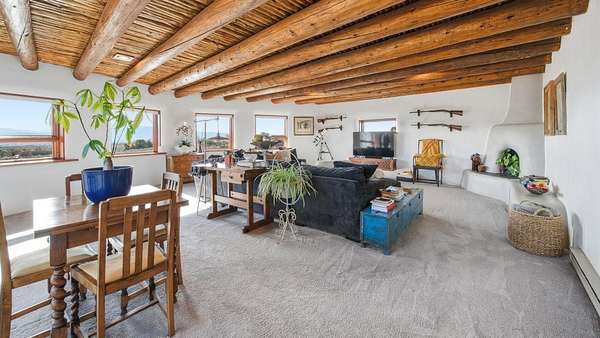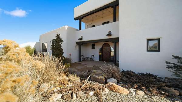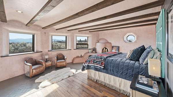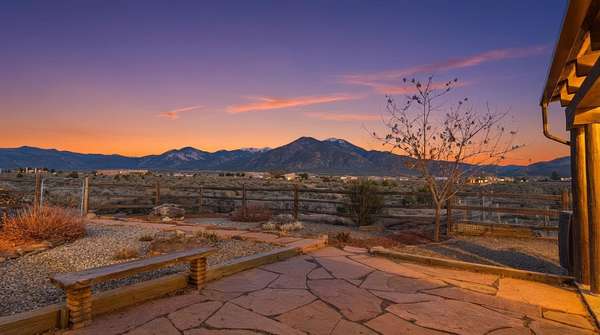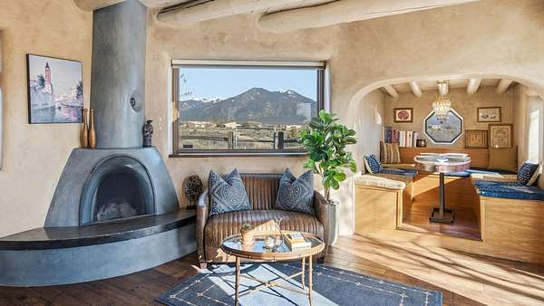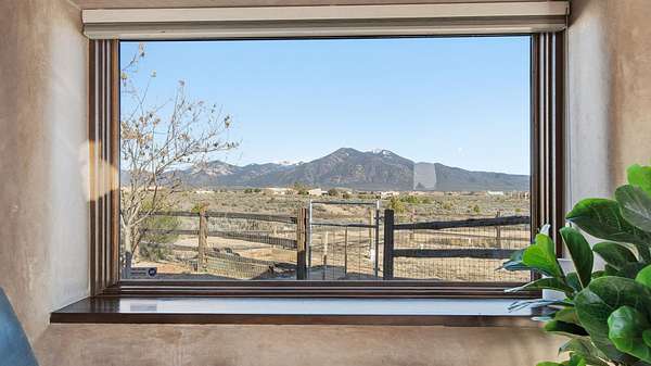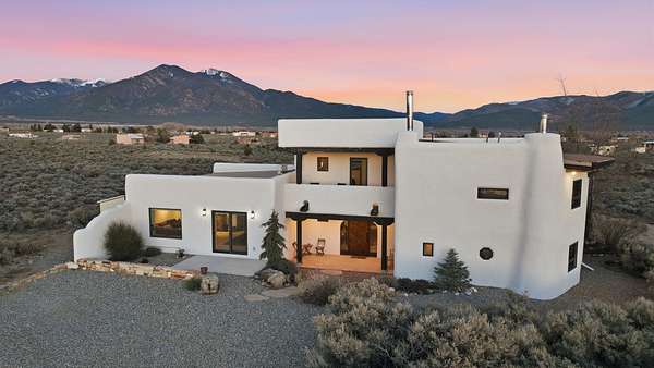 OVER $200,000 IN UPGRADES IN 2025! NEW ROOF, NEW SEPTIC, NEW STUCCO (12-year warranty), TWO MINI-SPLIT SYSTEMS, FULL LUXURY KITCHEN RENOVATION. Modern Adobe Mastery with unmatched location! This exquisite 3-bedroom, 3.5 bath true Taos adobe home offers 3,350 sqft of modern luxury. Perfectly placed - about 20 minutes to Taos Ski Valley and roughly 10 minutes or less to the Historic Taos Plaza - this home is sited on 2.27 acres in the highly sought after Blueberry Hill neighborhood in Taos. Panoramic views of Taos Mountain, Taos Valley, and the Sangre de Cristo range create the perfect backdrop for year-round mountain retreat living. Truly move-in ready, this immaculate home features diamond finish Venetian plaster, fresh paint, coved and viga ceilings, three wood-burning kiva fireplaces, handcrafted doors, designer lighting and Hunter Douglas blinds throughout. A newly renovated chef's kitchen/dining room features a kiva fireplace, top-of-the line Quartzite countertops, SubZero refrigeration, Wolf dual fuel six-burner gas range, microwave drawer, custom rift sawn white oak cabinetry and pantry with pullouts alongside an oversized island with ample storage and seating.A built-in dining nook with wrap-around banco bench that seats 8 comfortably is a true showstopper and features additional in-seat storage. Oversized picture windows, solar powered Velux skylight with rain sensor and glass exterior door offer abundant natural light and pulls the mountain landscape indoors. The kitchen/dining room opens to the north and south patios featuring mature landscaping, drip irrigation, basalt stone fountain and built-in banco seating for alfresco dining or cocktails. The home features two full primary suites. On the first level, escape to the oversized primary suite with a kiva fireplace, beam and coved ceiling, ensuite bath with walk-in pebble-tiled shower and large walk-in closet. The second level primary suite has a sunset balcony, operable skylight, and oversized picture window with Taos Mountain views. The modern ensuite bath features French limestone tile floor, Kohler Purist plumbing, walk-in shower with bench, oversized rain shower head and full body sprays. Multiple living spaces include a newly renovated 700 sf open living/dining space, guest bedroom (or bonus/office space) large enough to accommodate two full sized bunk beds sleeping up to 8. On the second floor, the upstairs great room showcases a stately kiva fireplace, authentic viga/latilla ceilings and large panoramic windows that mirror the primary suite below. This mountain sanctuary seamlessly blends luxury living with the beauty of northern New Mexico. Truly a rare gem in the heart of Taos.